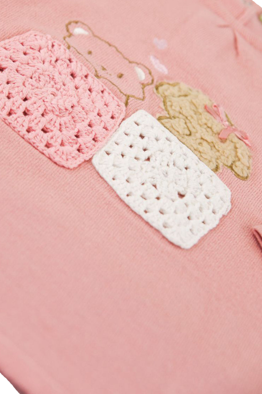 Kleid aus weicher Viskose mit Rundhalsausschnitt und langen Ärmeln. Druckknopfverschluss hinten und Häkelstickerei vorne