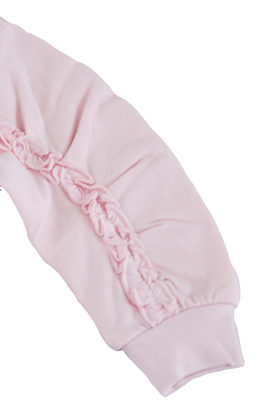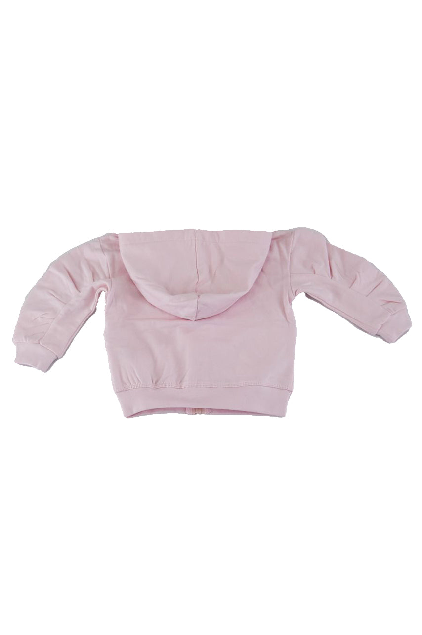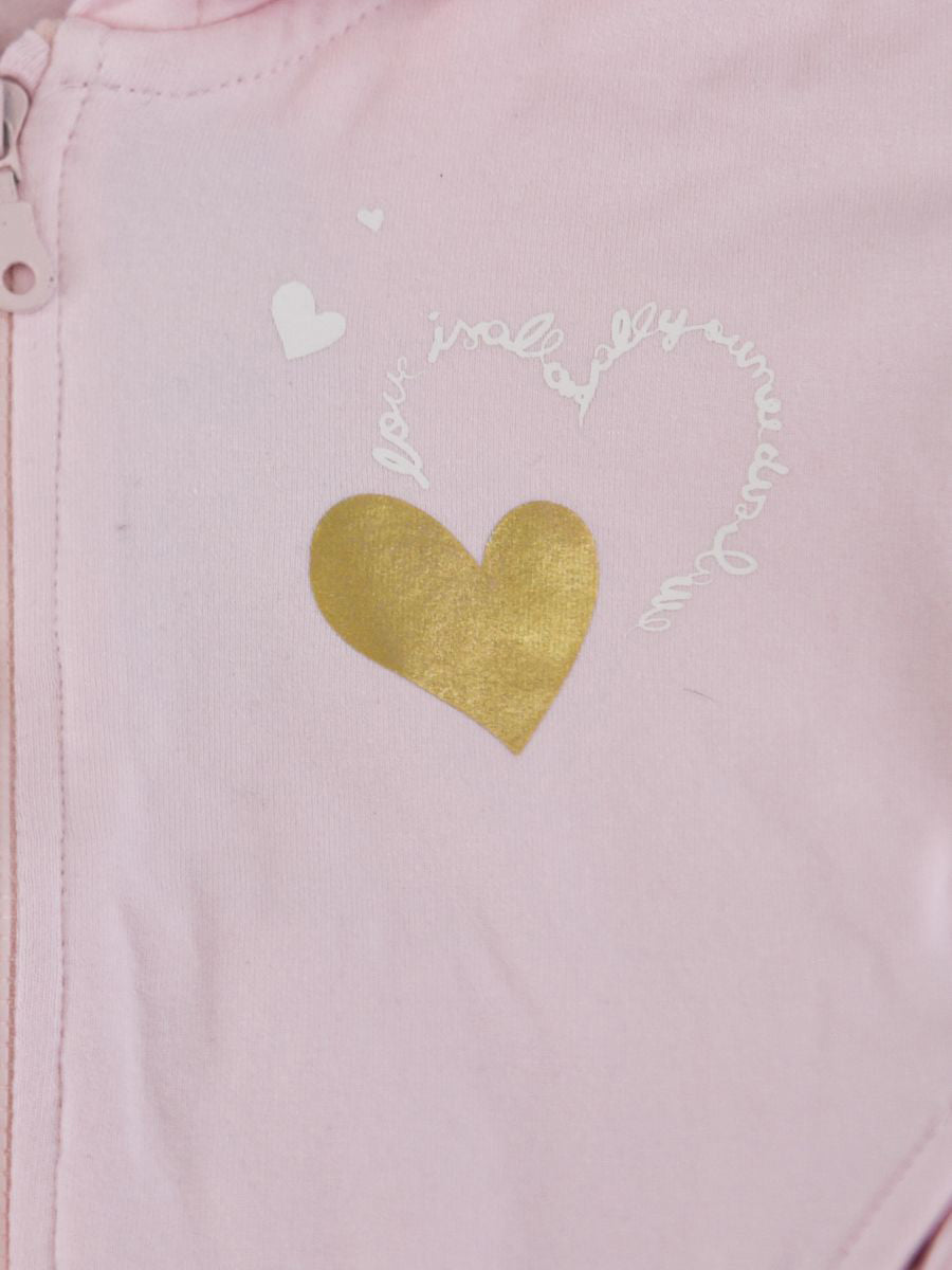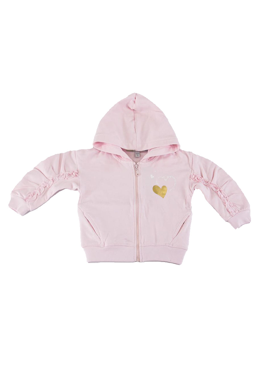 Einfarbiges Sweatshirt mit seitlichem Herzdruck. Durchgehender Reißverschluss, Kapuze und Ärmel mit Rouge verziert