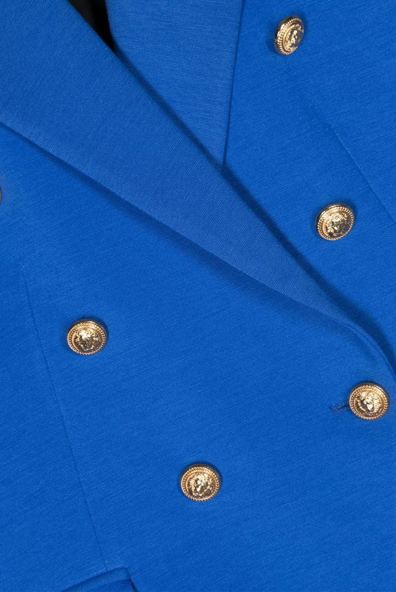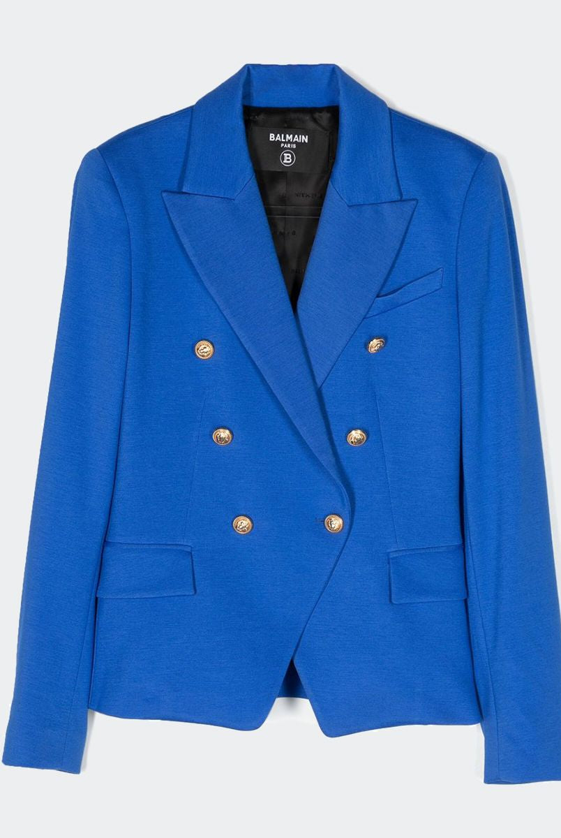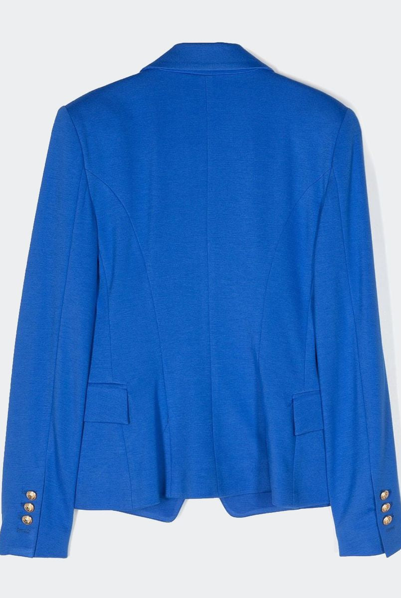 Einfarbige zweireihige Blazerjacke mit Knopfverschluss. Lange Ärmel mit geknöpften Manschetten und zwei Leistentaschen