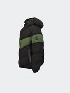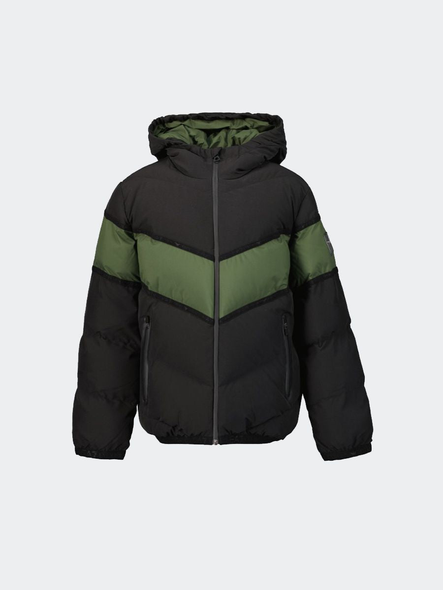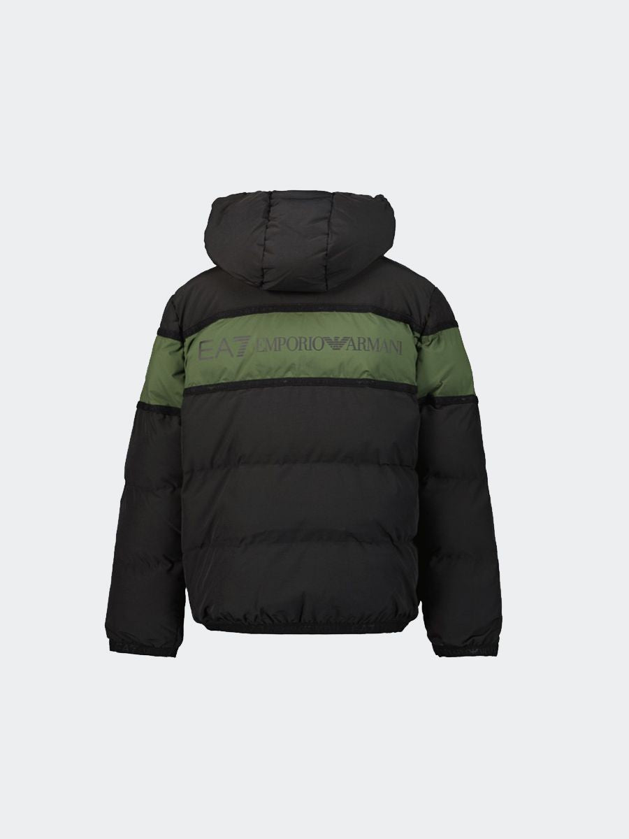 Zweifarbige Daunenjacke mit durchgehendem Reißverschluss und Kapuze. Aufgesetztes Detail mit Logoschriftzug vorne am Rand der Manschetten und am Ende. Mit gerade geschnittenen Vordertaschen mit Reißverschluss.