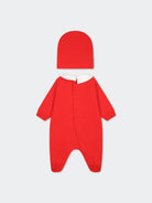 Einfarbiges Geschenkset aus Fleece-Baumwolle, bestehend aus Einteiler und Mütze. Playsuit mit Bubikragen und langen Ärmeln. Druckknopfverschluss auf der Rückseite mit Füßen. Teddy-Logo vorne