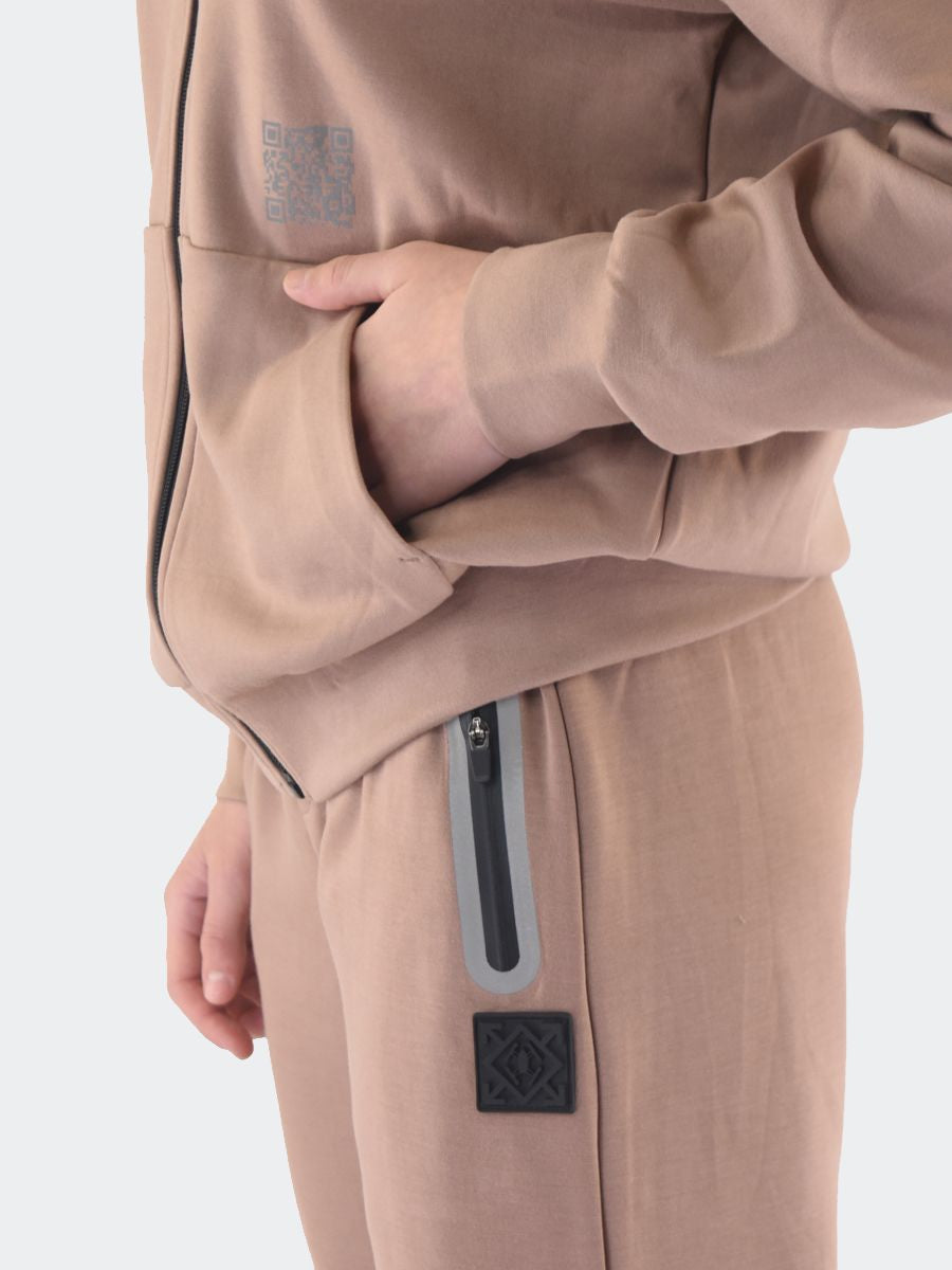 Passender Trainingsanzug mit Kapuzen-Sweatshirt mit durchgehendem Reißverschluss und QrCode-Reflex-Logo auf der Vorderseite und Relief auf der Rückseite und an der Kapuze. Taschen unten. Jogginghose mit elastischem, durch Kordelzug verstellbarem Bund, Reflex-Reißverschlusstaschen und elastischem Saum. Silikon-Logo-Patch und QrCode auf der Gesäßtasche. Der Anzug besteht aus Tech-Fleece-Gewebe mit einer Mischung aus Polyester und anderen technischen Materialien, die für Wärmeisolierung sorgen, ohne übermäßiges Gewicht hinzuzufügen. Hält den Körper warm und ermöglicht gleichzeitig eine gute Transpiration, um eine Überhitzung zu vermeiden
