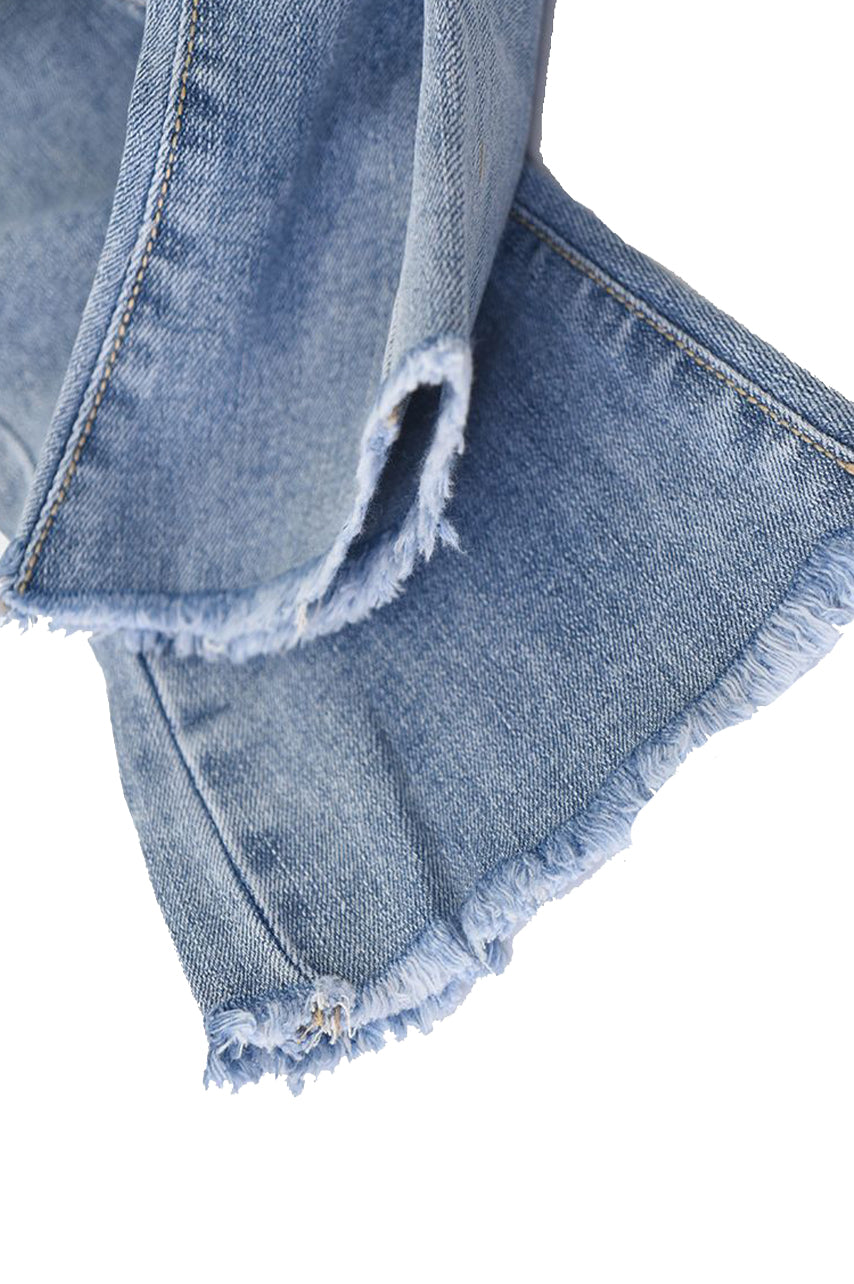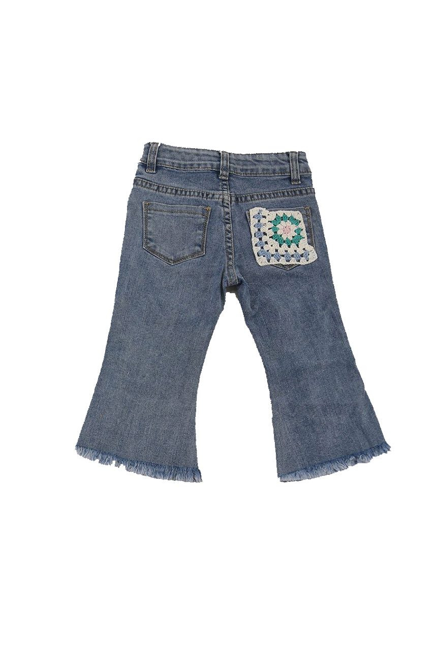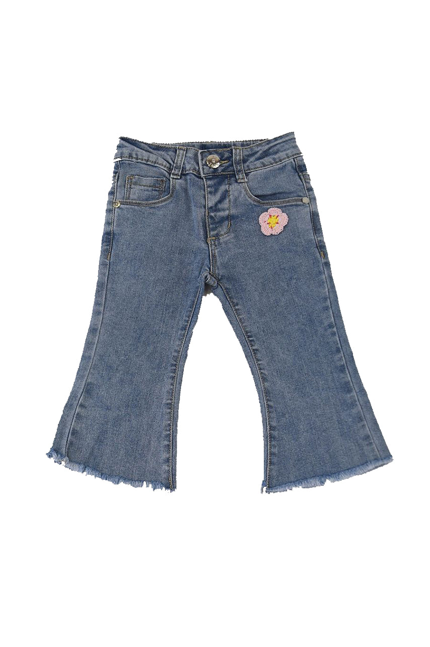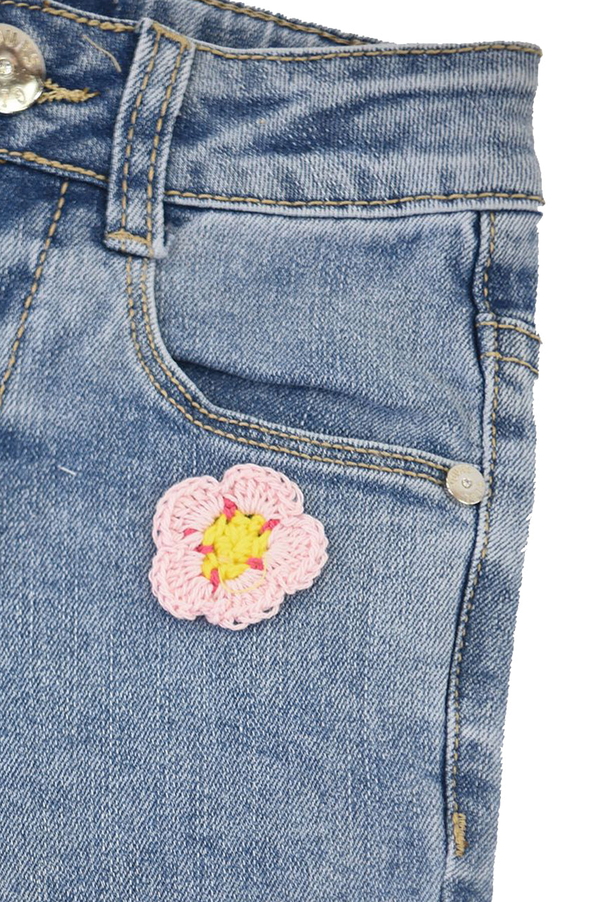 Jeans trousers with bows and decorative embroidery. Elastic waist with front button