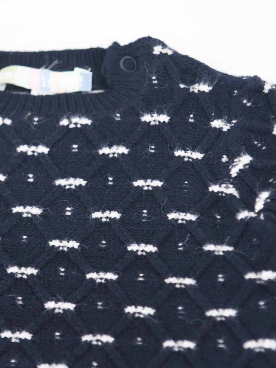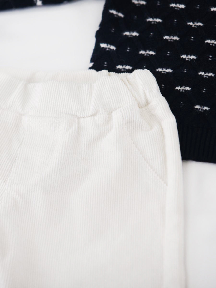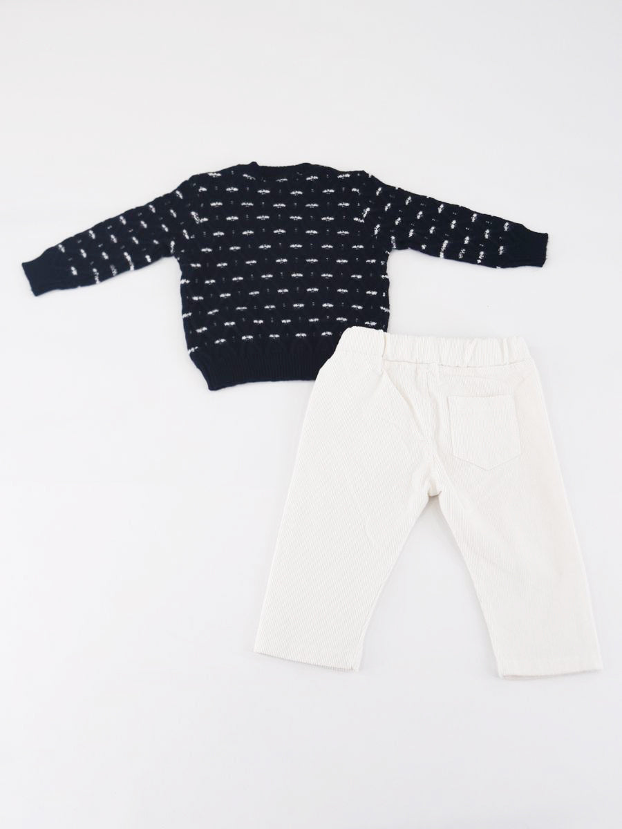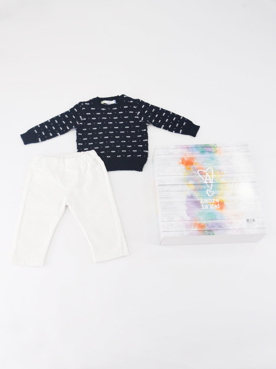 Complete set consisting of a long-sleeved crew-neck sweater with a diamond-shaped front decoration. Two snap buttons on the shoulder. Ribbed bottom and cuffs. Velvet trousers with elastic waistband. Drawer gift box included