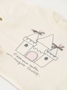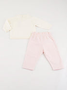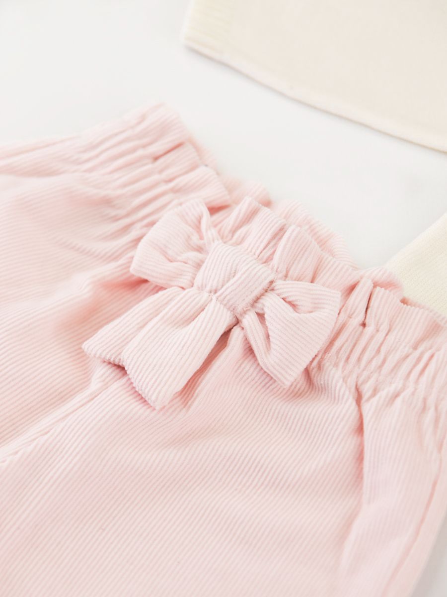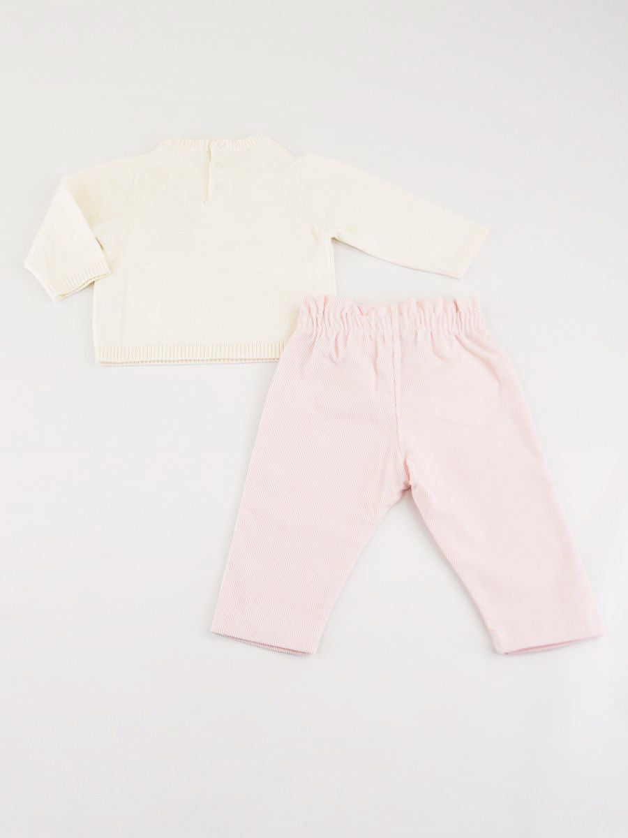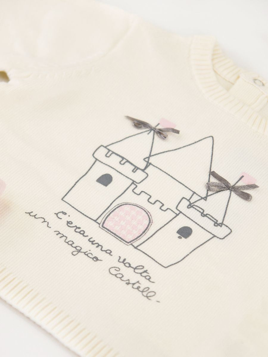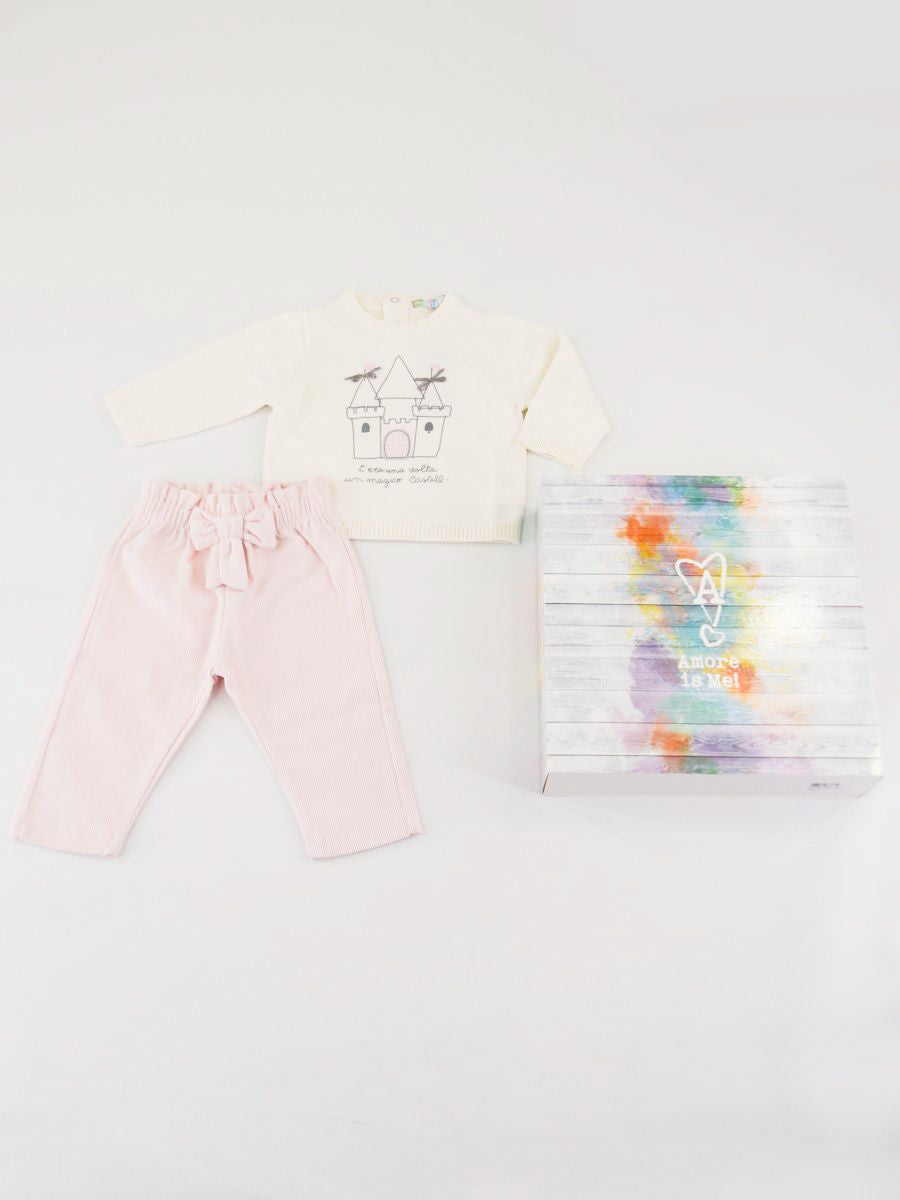 Set consisting of a long-sleeved crew neck sweater with front print. Two snap buttons on the back and ribbed bottom and cuffs. Velvet trousers with elastic waistband enriched with a matching bow. Drawer gift box included