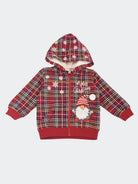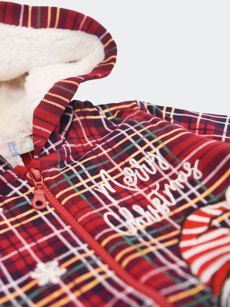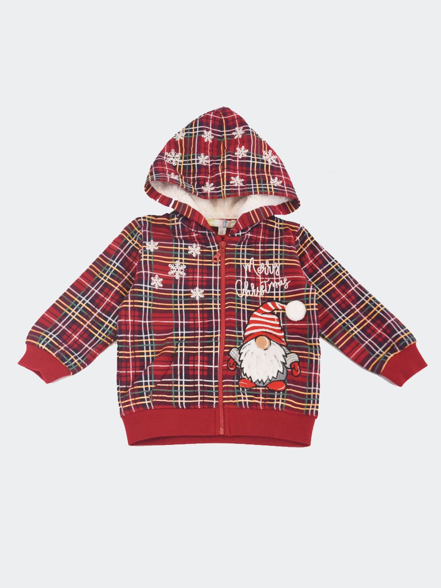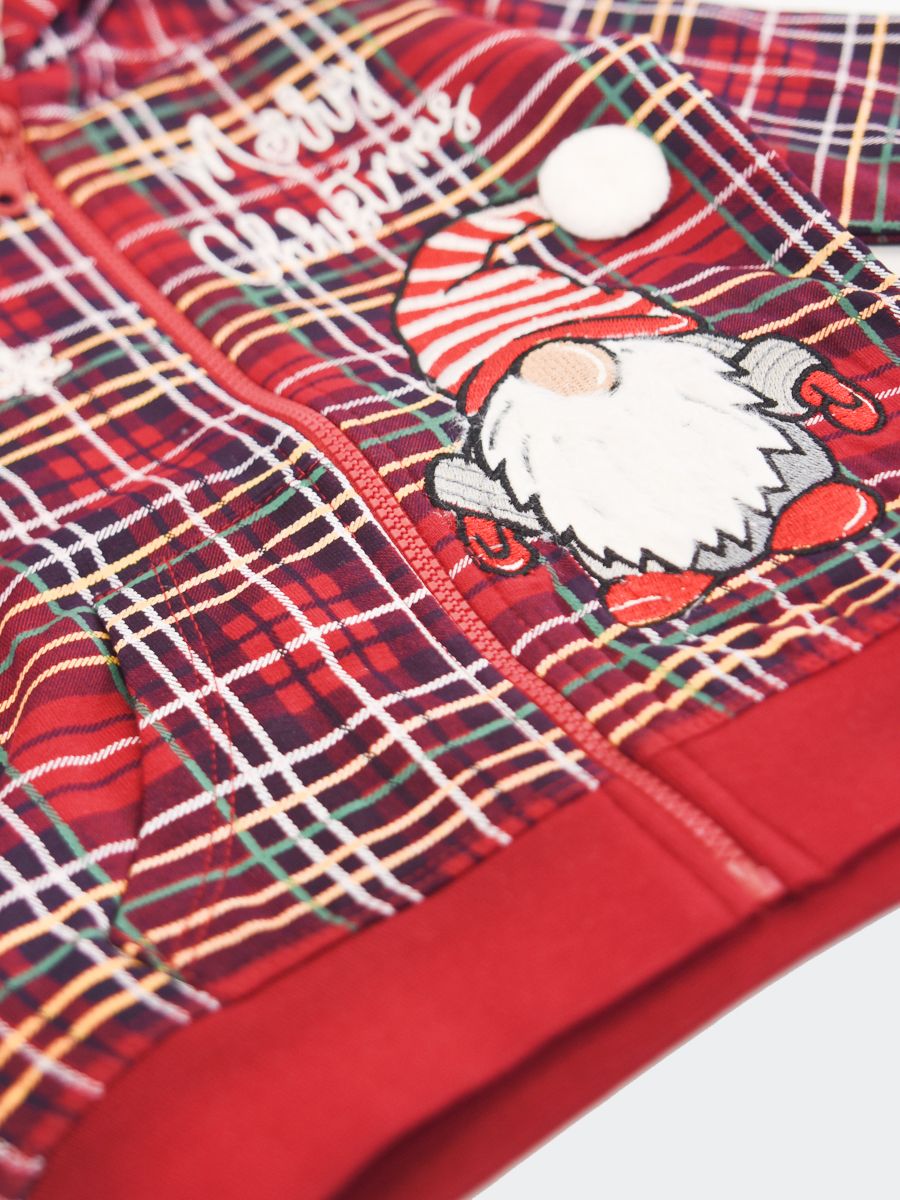 Tartan pattern sweatshirt with Allover Christmas gnome and star embroidery. Hood with internal teddy bear. Ribbed cuffs and bottom