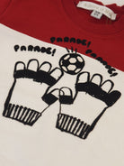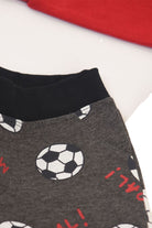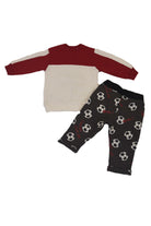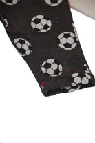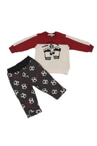 Two-tone crewneck sweatshirt tracksuit with press studs on the shoulder with a raised print on a football theme. Allover trousers with themed balls