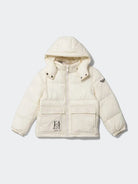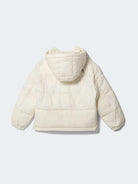 Padded jacket with zip-up hood. Long sleeves with elastic cuffs and front pockets. Contrasting colour embossed print on left sleeve and right front pocket.