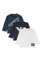 T-shirt set of three T-shirts for newborns Emporio Armani Kids presents itself as a work of elegance and practicality designed for the little ones. With its lively multicolored design these lightweight cotton t-shirts offer a feeling of comfort and freshness. The refined logo print on the front gives a touch of exclusivity to each garment while the crew neck and long sleeves ensure an excellent fit. The back closure with press stud makes it easy to dress making every moment pleasant and effortless. The straight hem completes the modern and functional look perfect for every occasion. To care for this precious set we recommend machine washing in cold water avoiding bleach and tumble drying. It is recommended to iron at low temperature and not dry clean to maintain the qualities of the fabric intact. Bimbivip emerges as a prestigious partner of luxury brands offering a consolidated history in e-commerce and retail sales throughout Europe. Their commitment to ensuring maximum customer satisfaction is reflected in the selection of exclusive items such as these. With Bimbivip customers can count on impeccable service and a wide range of high-quality products, thus ensuring an unparalleled shopping experience.