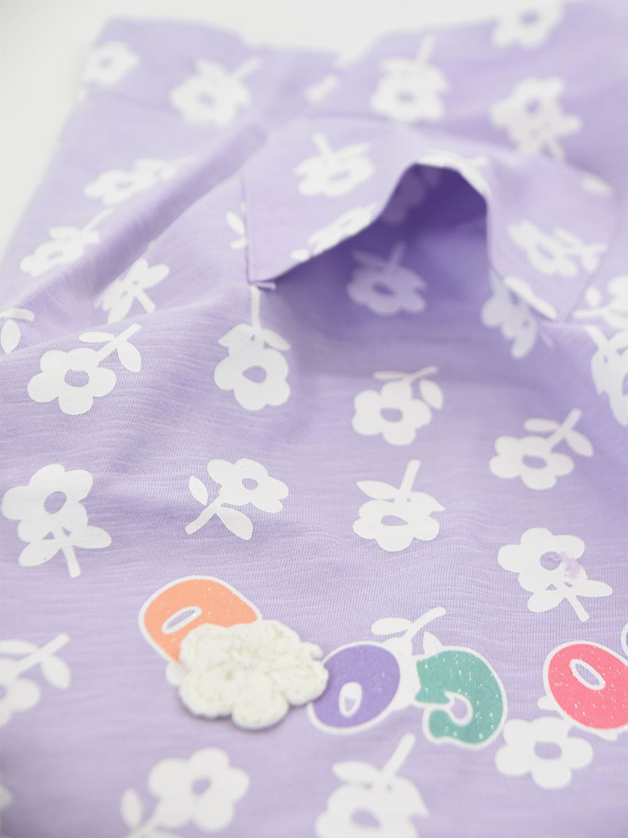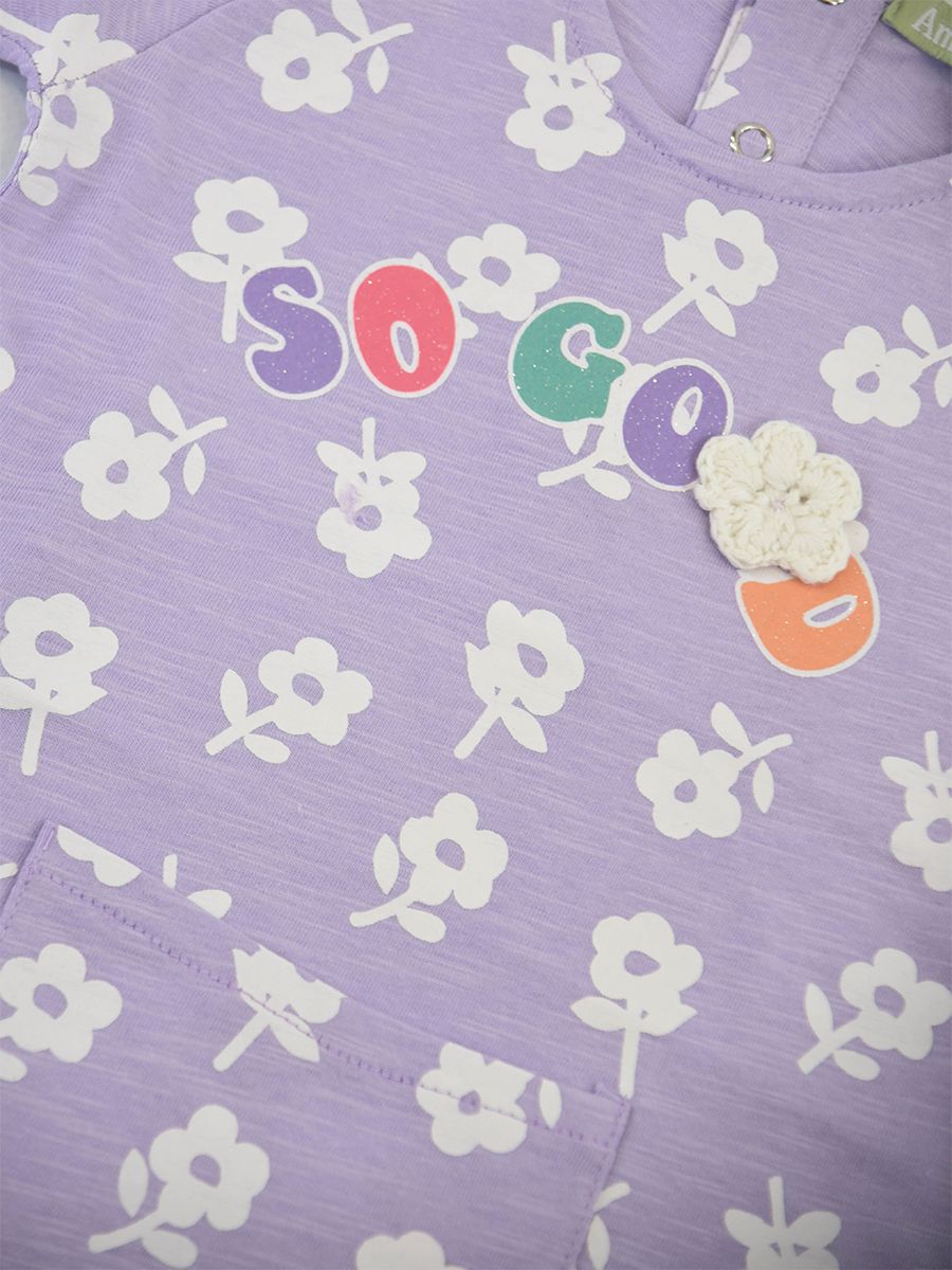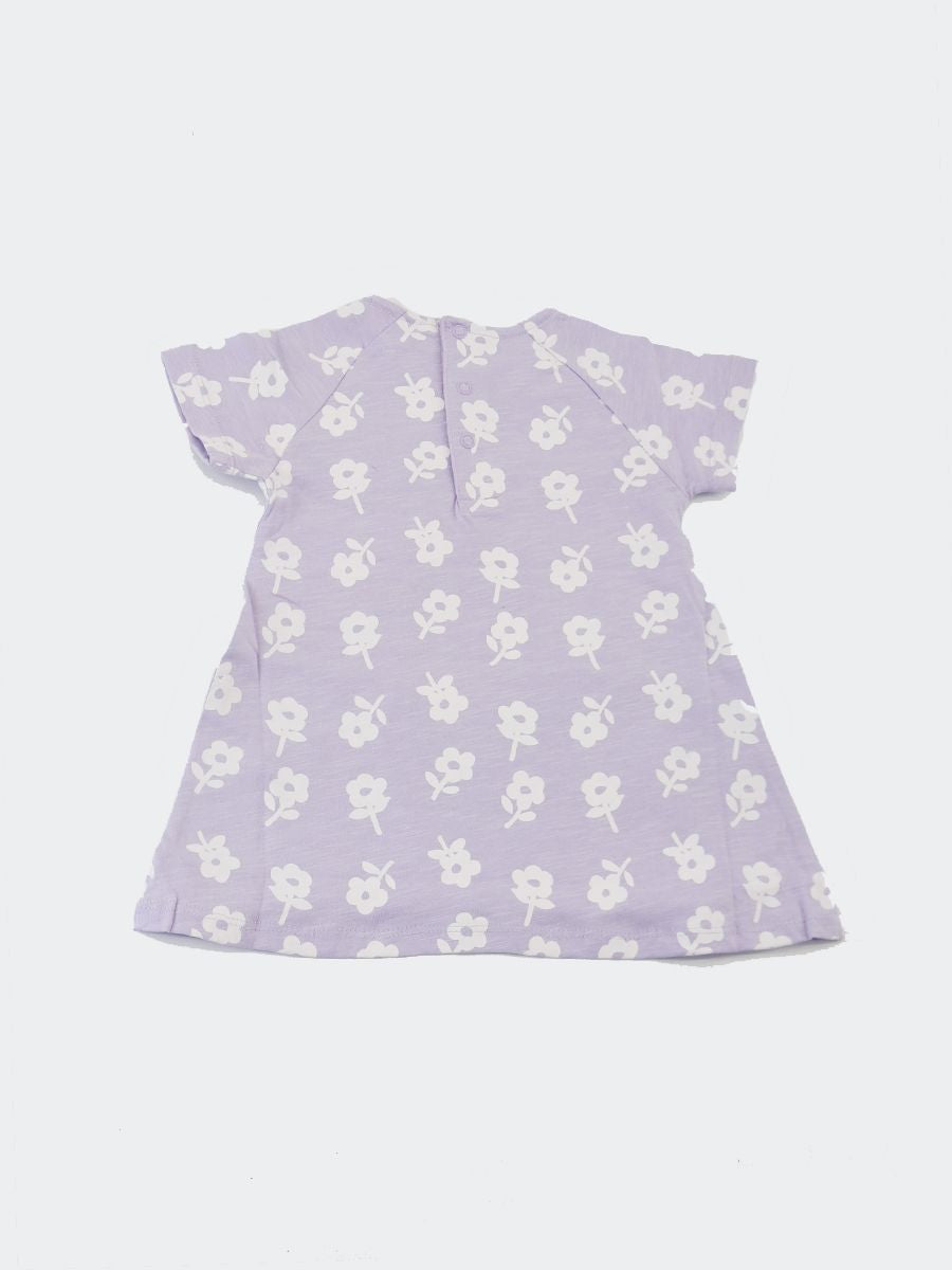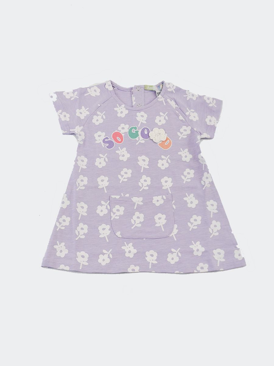 Crew neck dress with short sleeves and front pocket. Allover floral pattern