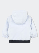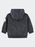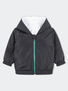Lightweight Reversible Polyester Jacket with hood and contrasting color zip closure. Elastic waistband. Large logo print on the front on one side. Red logo badge on the sleeve.
