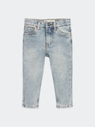 Five-pocket jeans with uneven light wash. Skinny model
