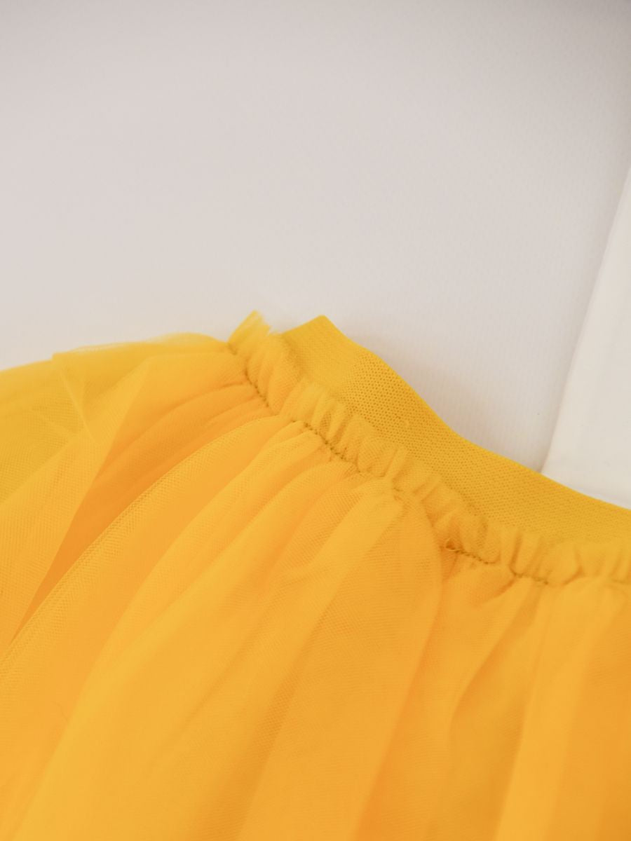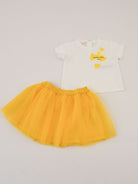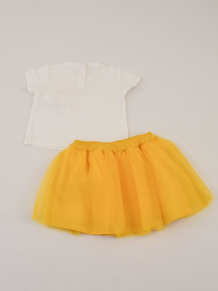 solid color with crew neck T-shirt, short sleeves and bow-themed logo on the chest and stretch tulle skirt