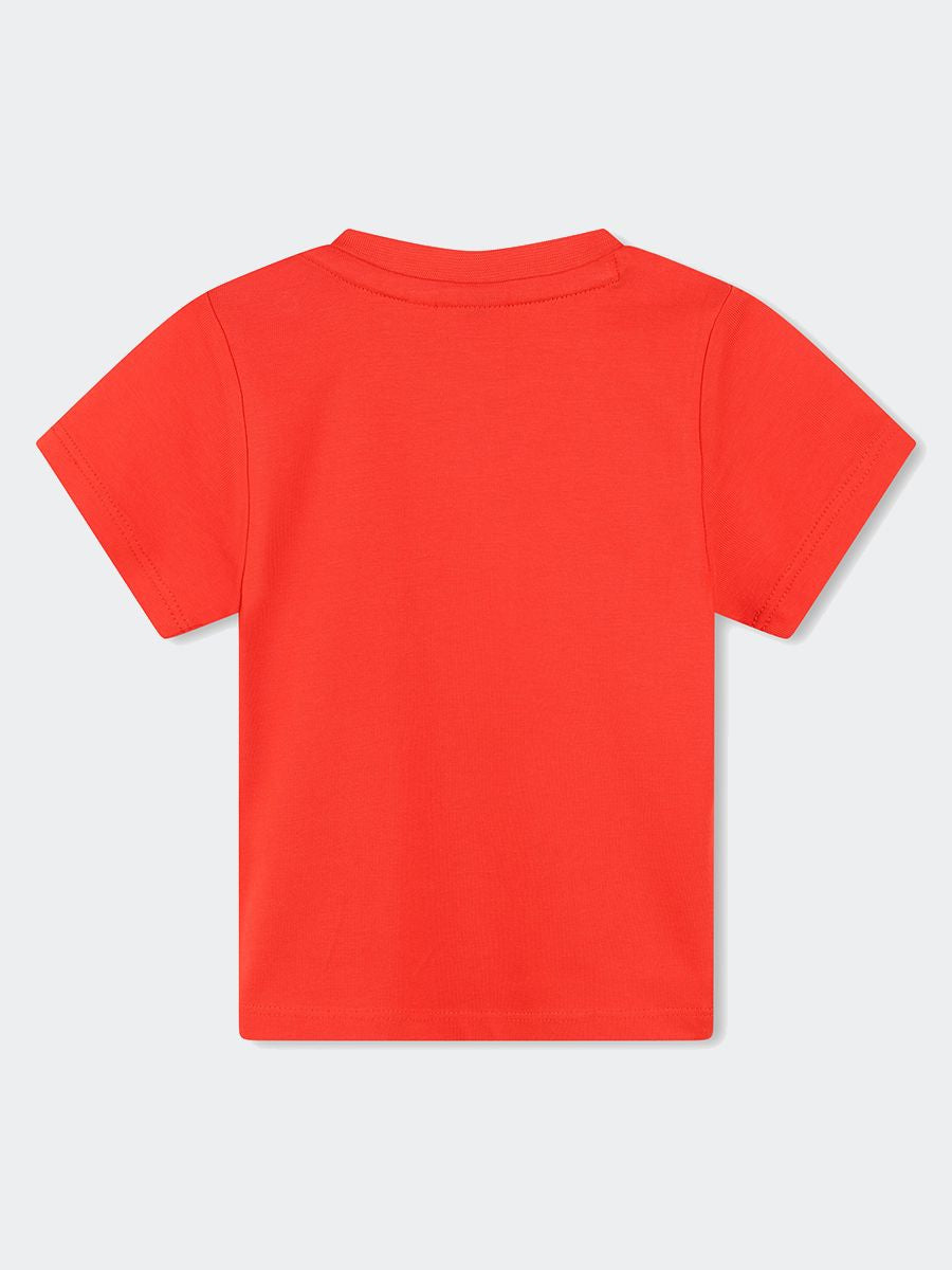 Short-sleeved T-shirt in 100% cotton jersey with snap closure on the shoulder and large printed logo on the front