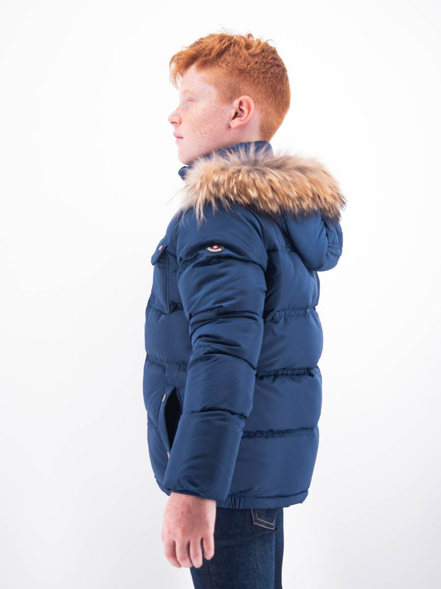 Piumino modello trapuntato corto con cappuccio in pelliccia e collo alto con chiusura bottoni. Tasca con aletta sul cuore e due in vita con chiusura bottoni a pressione. Doppia apertura centrale zip e bottoni. Adatto per climi invernali.