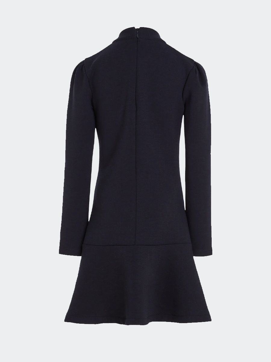 Denim dress with crew neck and automatic button closure also on the cuffs. Ruffles on the bottom. Logo embroidery on the heart side