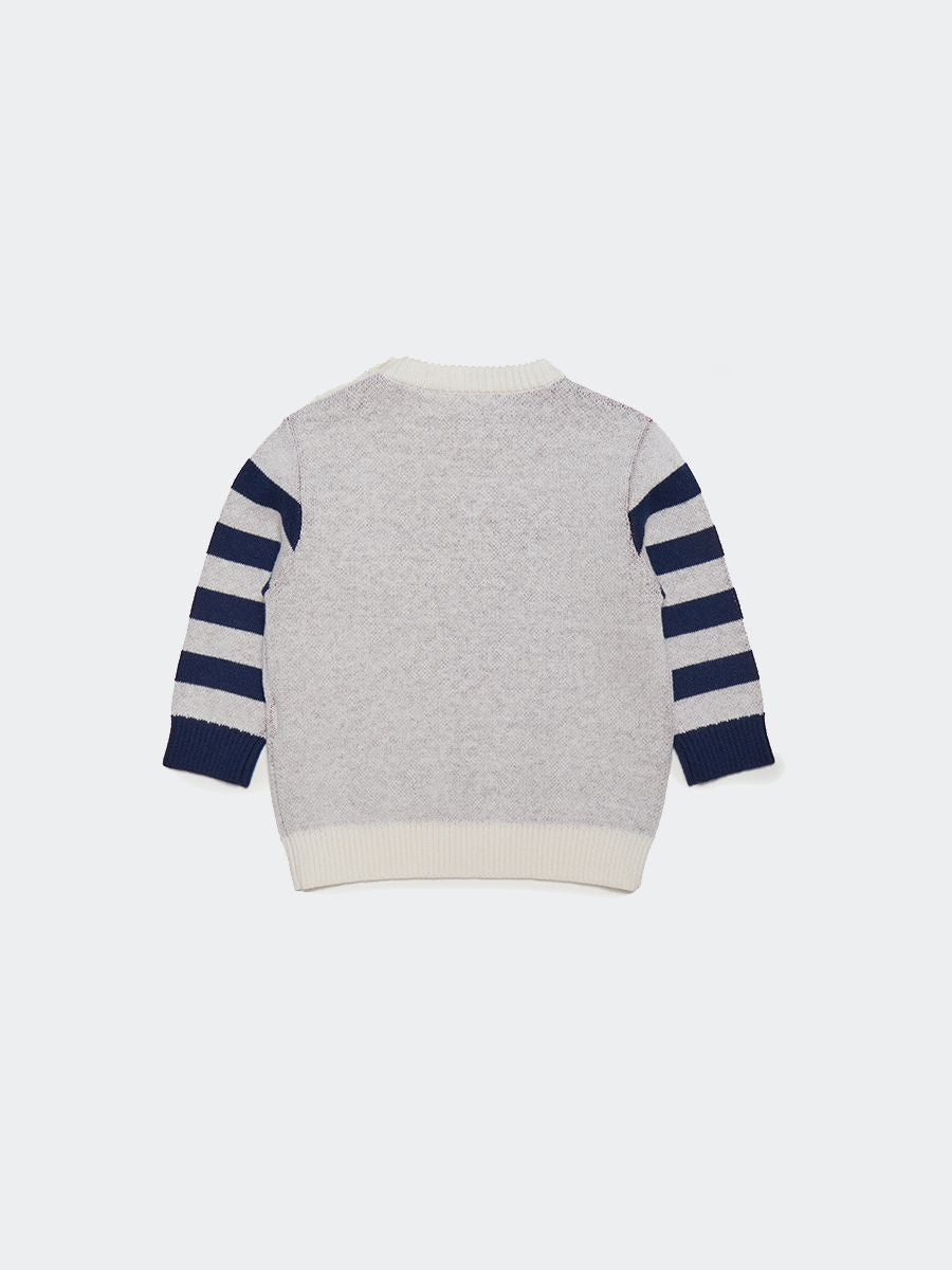 Sweater in wool and cotton yarn with personalized front logo. Buttons on the shoulder and striped sleeves. Ribbed collar, cuffs and bottom