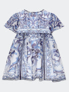 Blue and white dress with a round neck, short sleeves with ruffles, a belted waist, an all-over majolica print, and a back zip closure. Matching culottes with an elastic waistband.