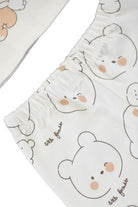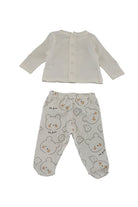 Set consisting of a long-sleeved crew-neck t-shirt with back buttons and front embroidery. Matching teddy bear-print trousers