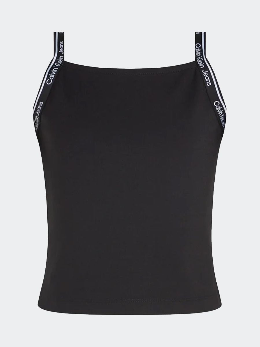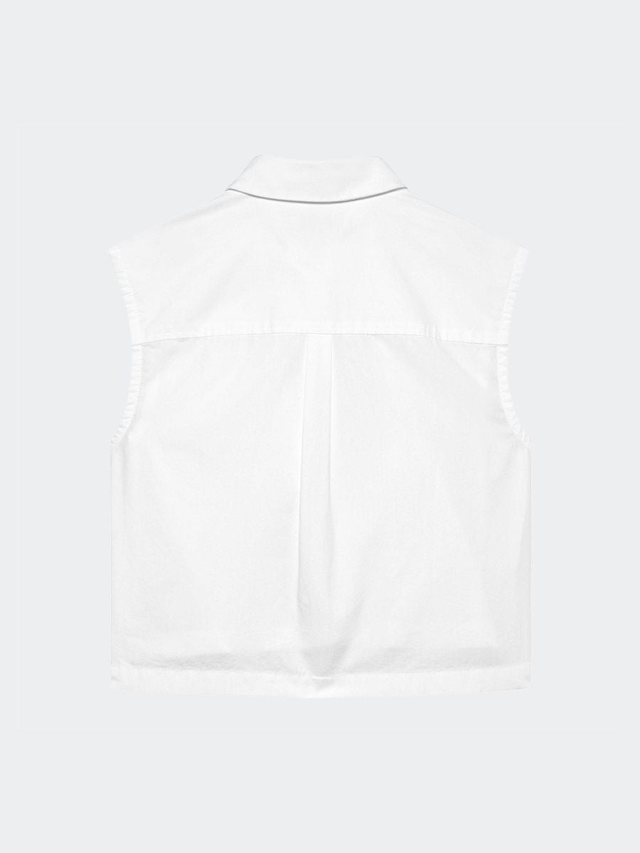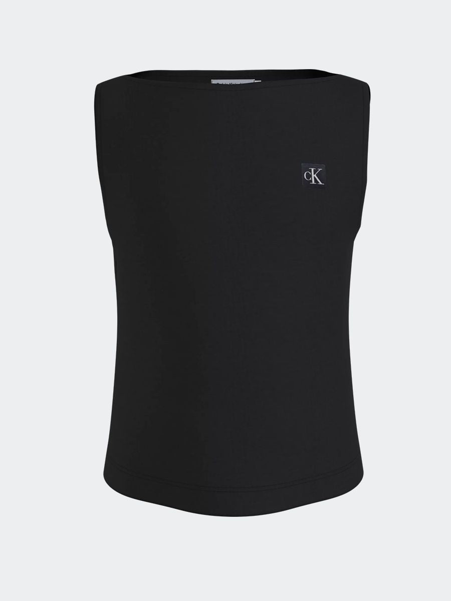 Narrow shoulder denim top with side seams and woven logo label on the bottom
