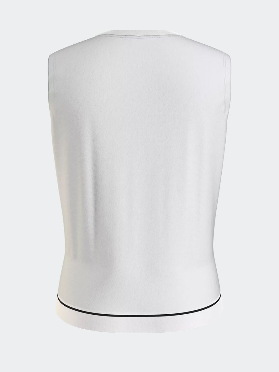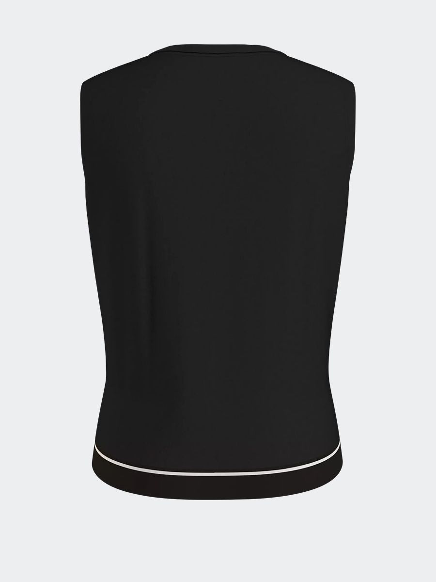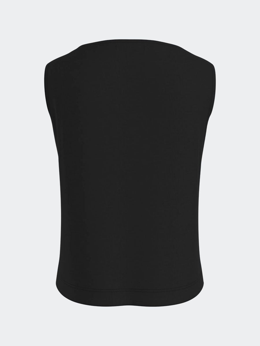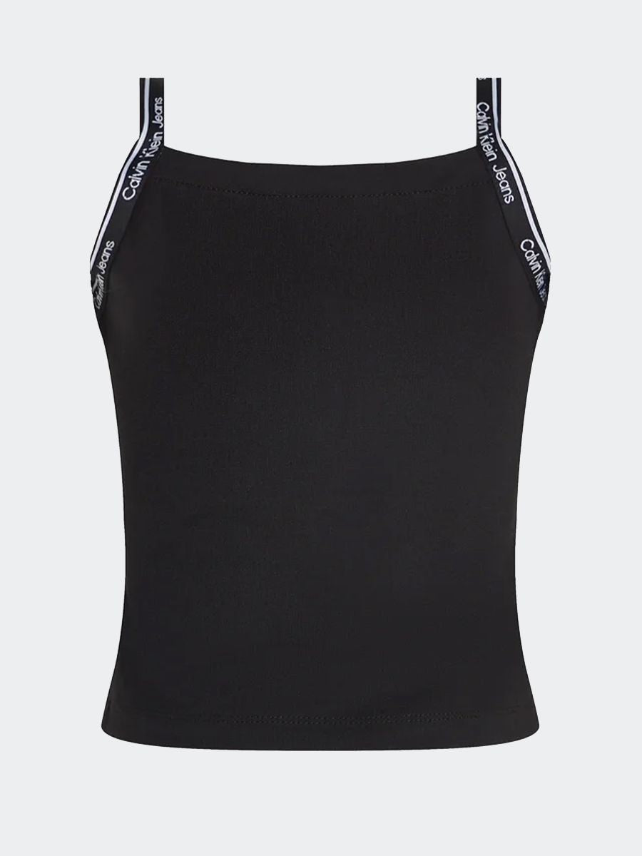 Narrow shoulder denim top with side seams and woven logo label on the bottom