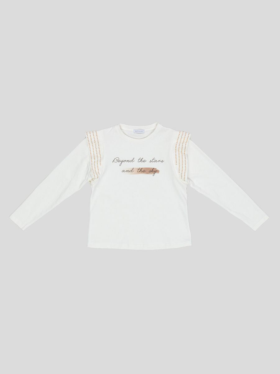 T-shirt girocollo a manica lunga con polsi e fondo dritto. Stampa frontale con tessuto decorato da Borchie di colore Oro sul giromanica