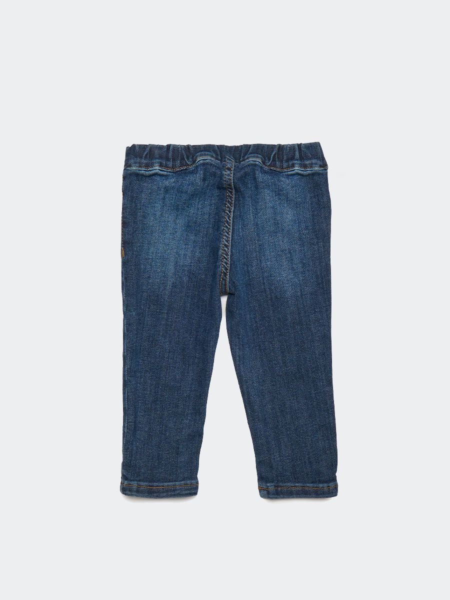 Five-pocket jeans in stretch denim fabric. Adjustable waist with drawstring, belt loops and logo patch on the back