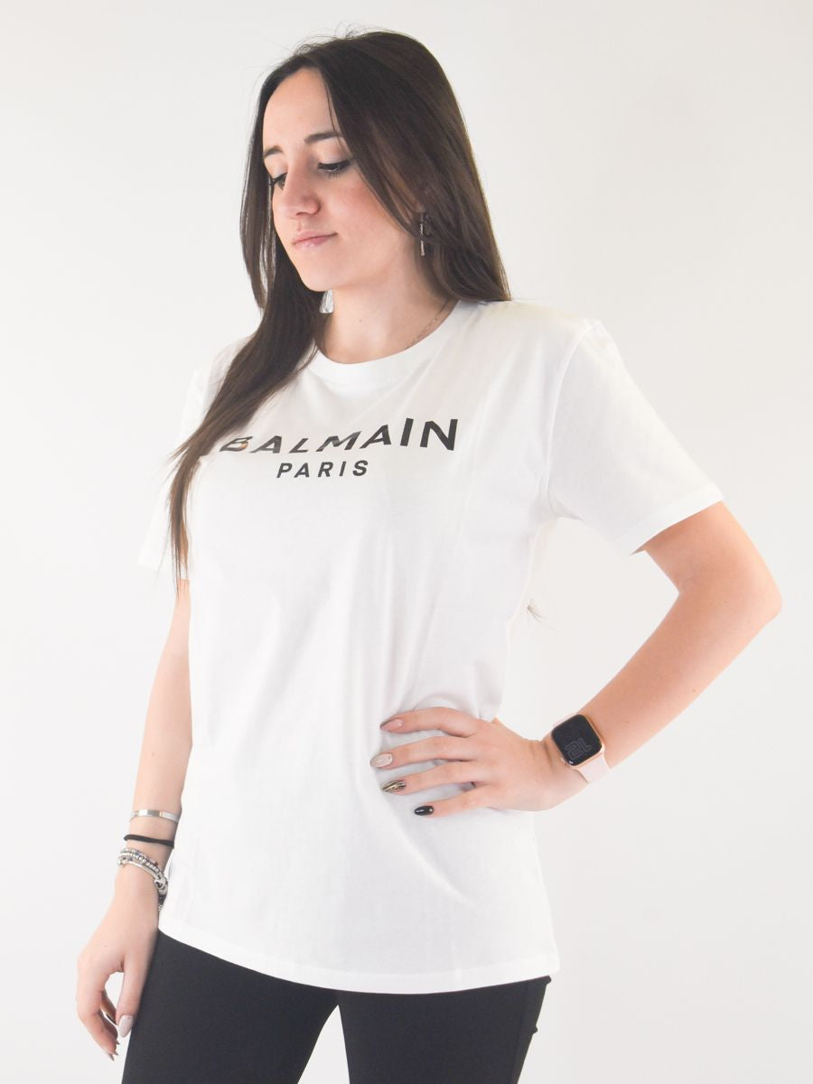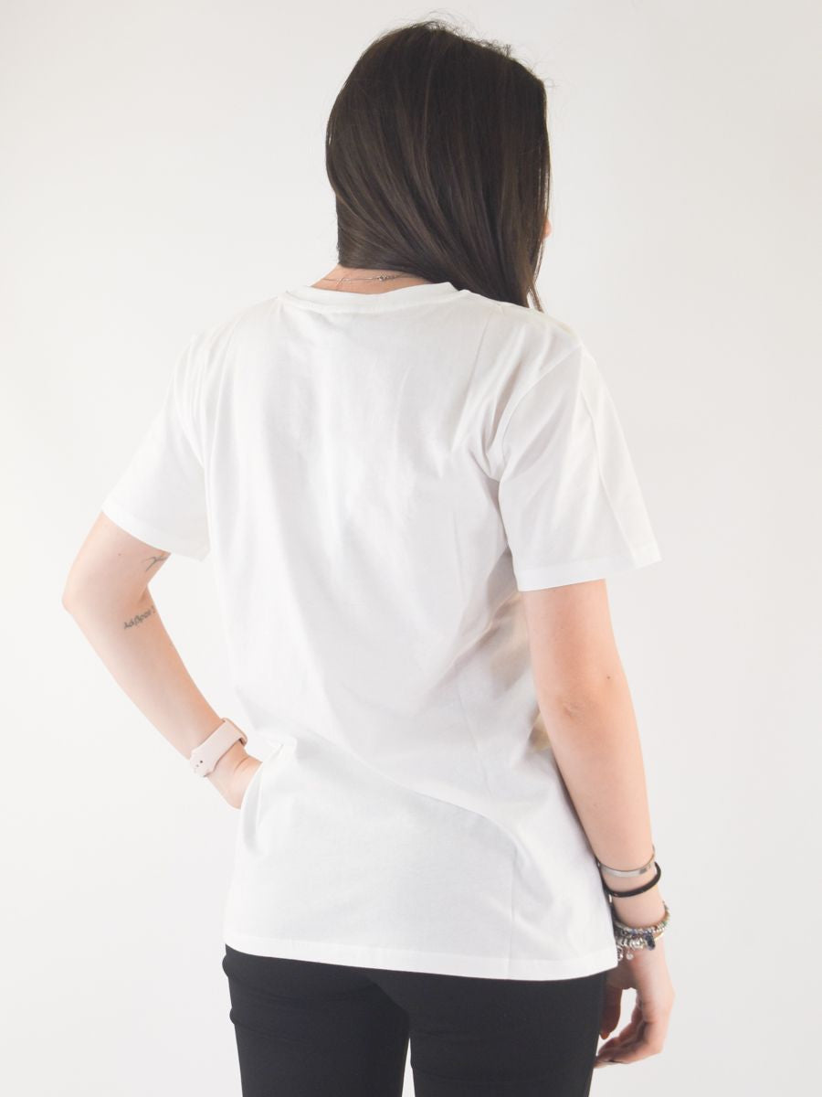 Crew neck T-shirt with short sleeves and gold print. Straight cut