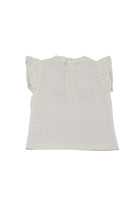 Solid color crew neck short sleeve cotton T-shirt with buttons on the back. Voila on the armhole