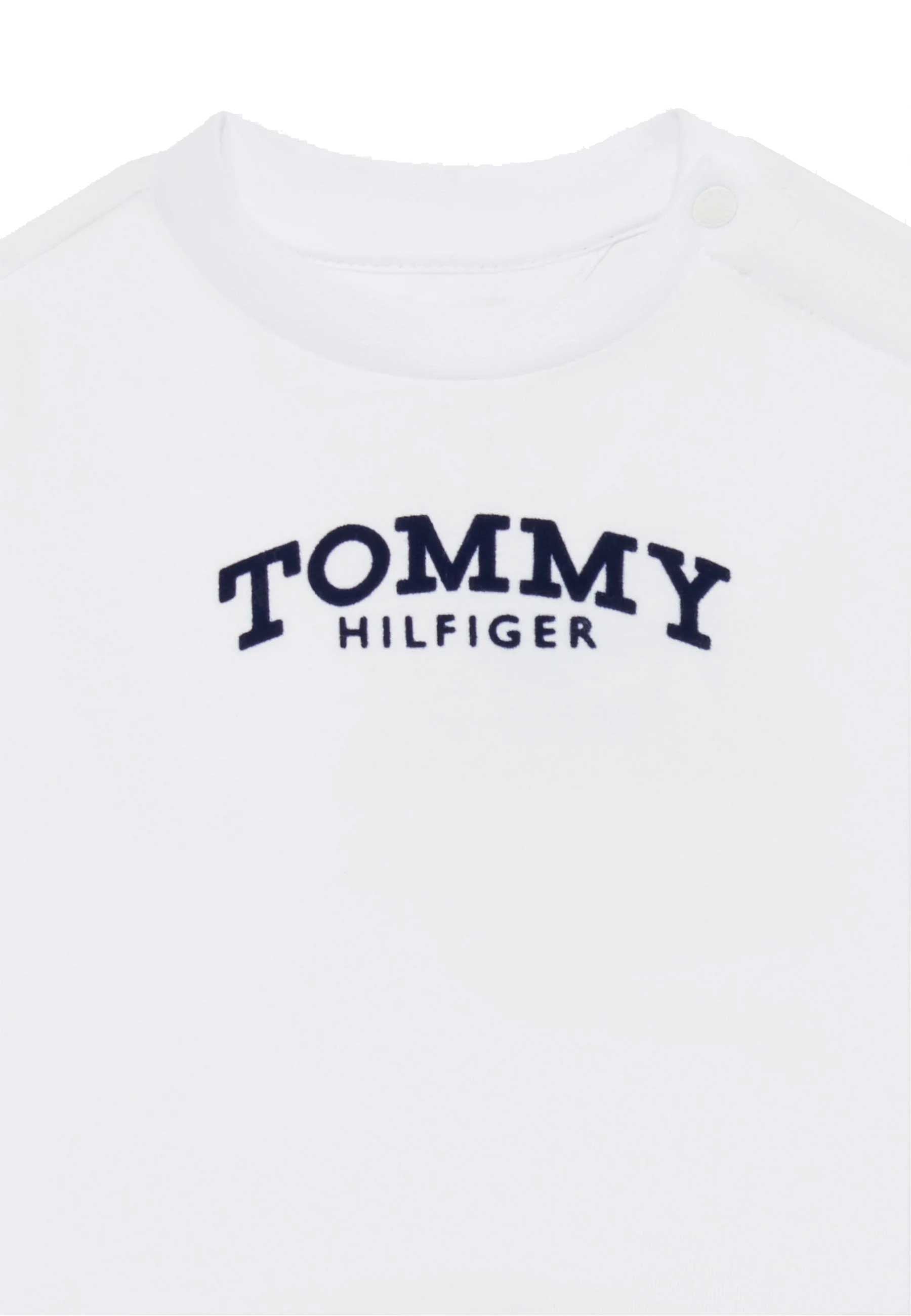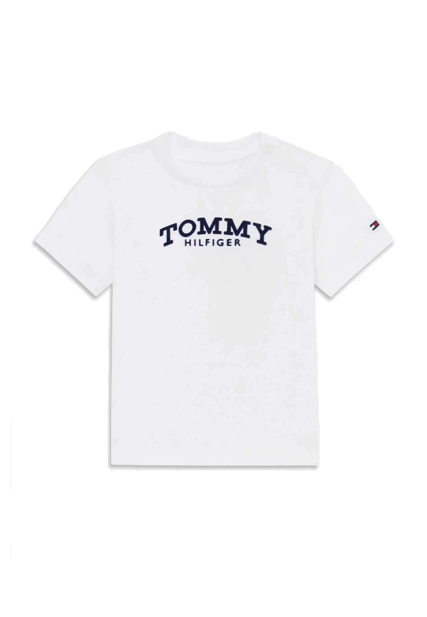 T-shirt per neonati Tommy Hilfiger esclusiva distribuita da Bimbivip partner storico affidabile e autorevole nel panorama europeo ecommerce e retail punto di riferimento per le famiglie che cercano qualità autenticità e marchi prestigiosi Bimbivip garantisce un'esperienza di acquisto sicura trasparente e gratificante con cura nella selezione attenzione al cliente e garanzia di originalità Il capo realizzato in maglia fine elasticizzata unisce comfort e morbidezza grazie all'alta percentuale di cotone e all'uso di fibre rigenerate sostenibili Taglio dritto per libertà di movimento girocollo classico rotondo chiusura a scatto corta per praticità e ventilazione cuciture piatte che proteggono la pelle rendono questa T-shirt un capo confortevole resistente e di valore perfetto per neonati attenti alla qualità e allo stile
