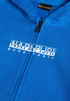 Full Zip solid color sweatshirt with hood and front logo print on the chest. Kangaroo pocket. Ribbed cuffs and bottom