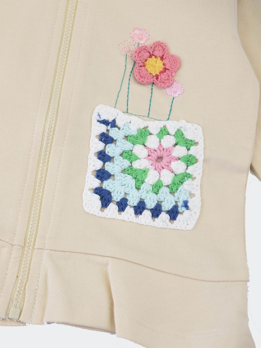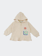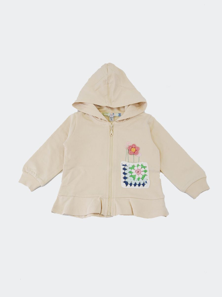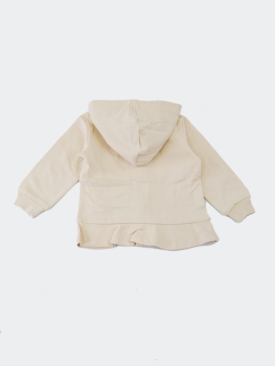 Lightweight solid color sweatshirt with zip closure and non-detachable hood. Voila on the bottom