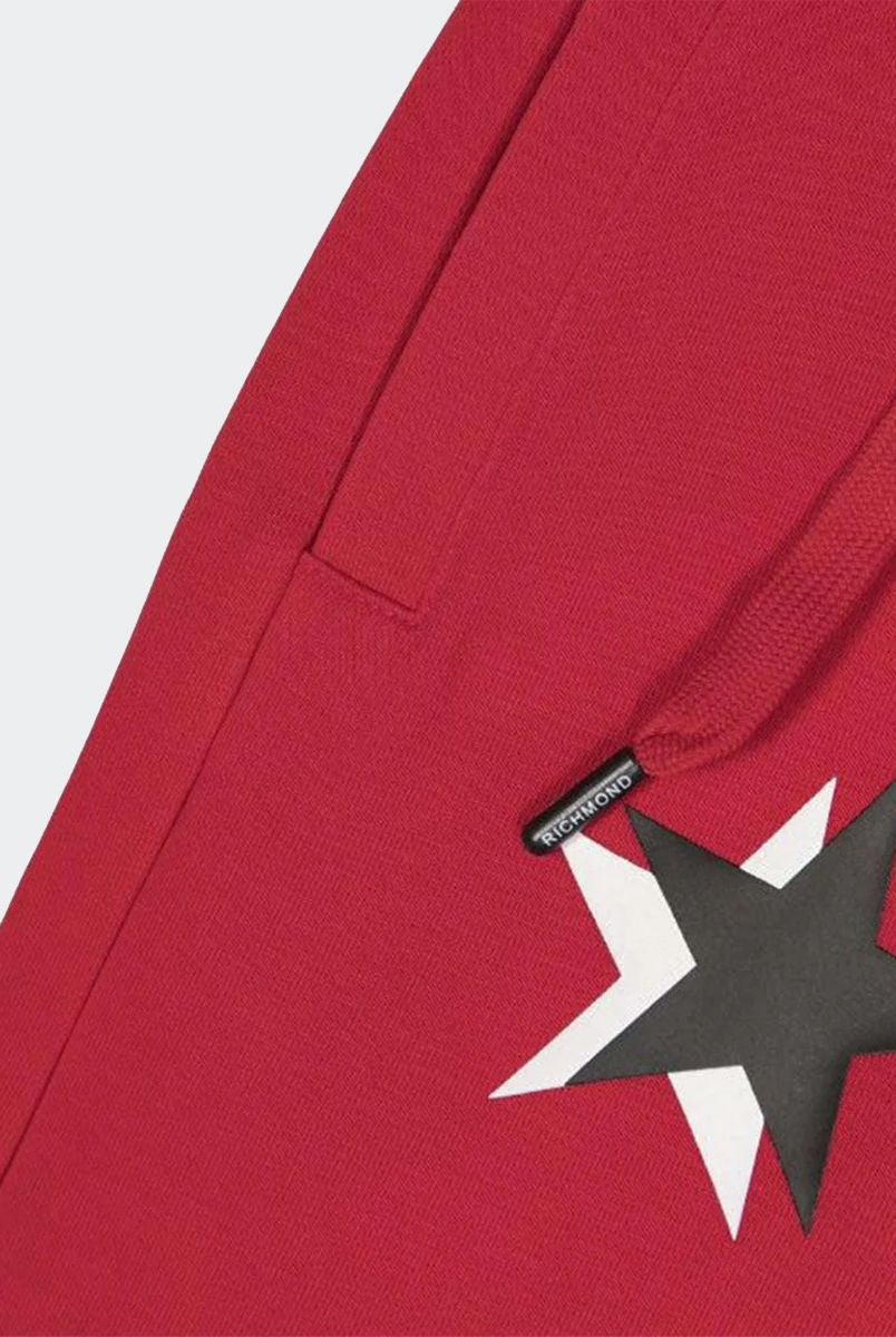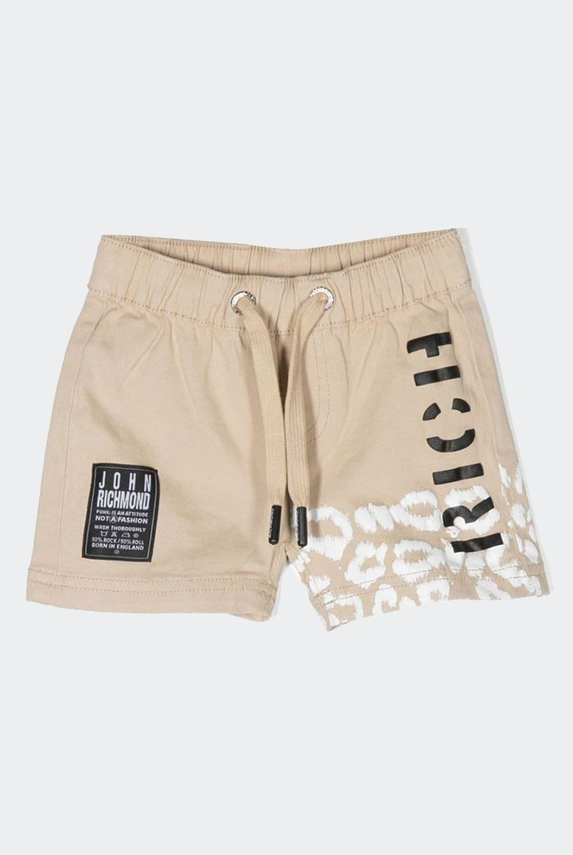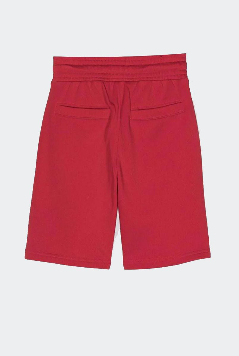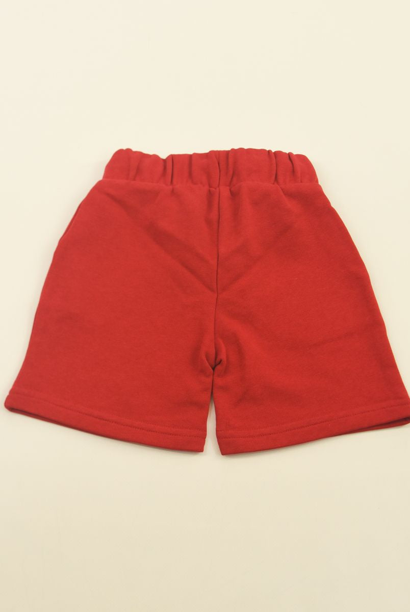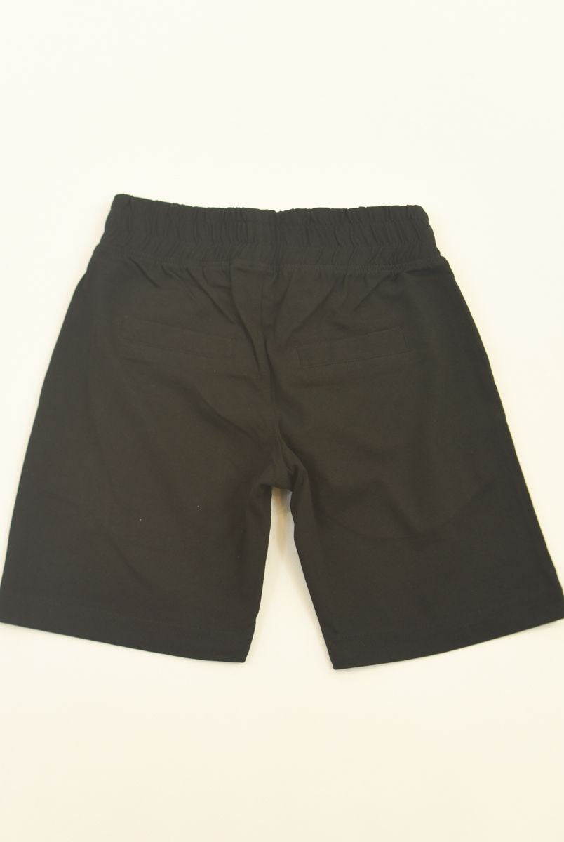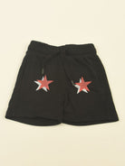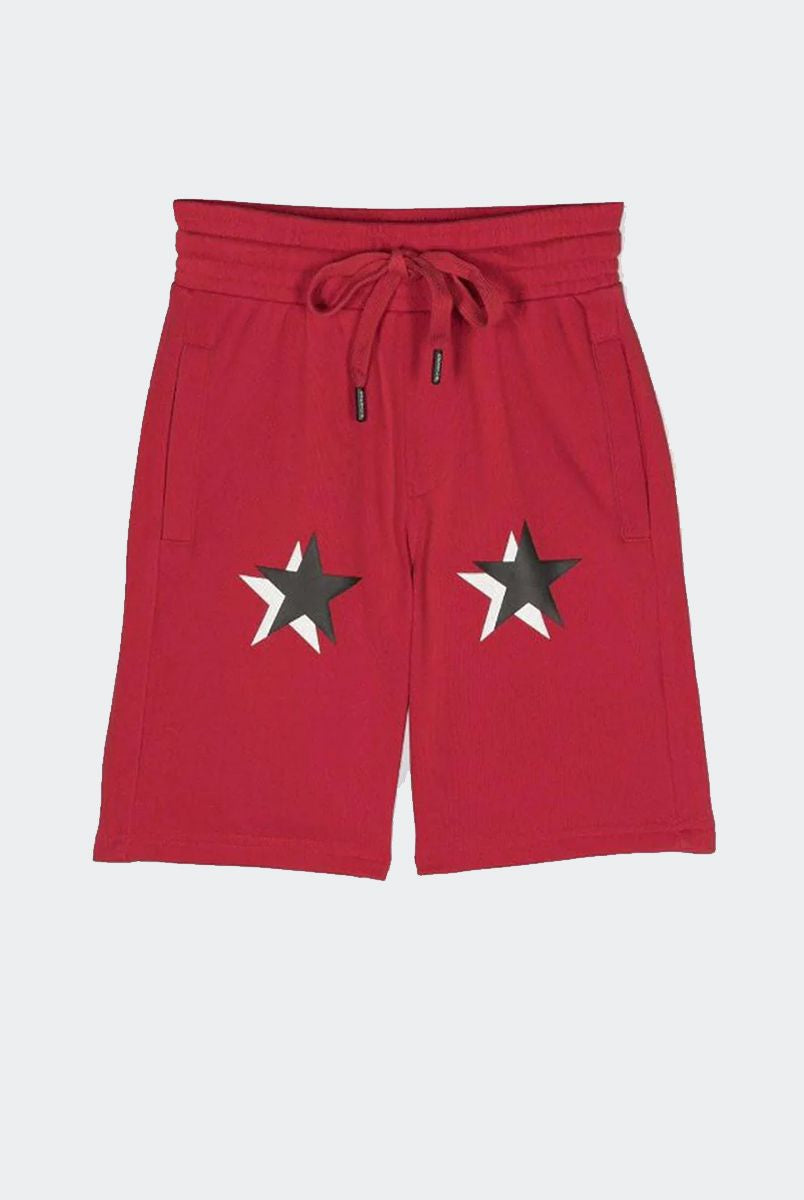 Solid color Bermuda shorts with front star print and welt and back pockets. Elasticated waist with adjustable drawstring