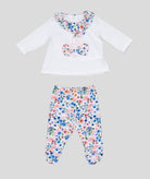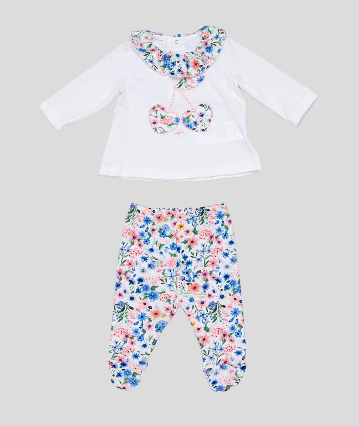Completo Sportivo completo fondo bianco con collo largo a fantasia. stampa frontale fantasia su ciliegie ricamate a forma di cuore