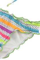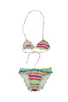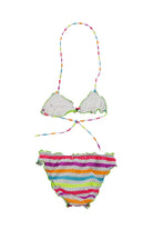 Costume in Lycra lined with multicolor striped and polka dot pattern. Triangle model with adjustable drawstring at the front and elasticated briefs
