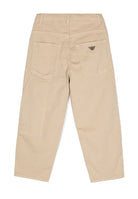 Mid-rise tailored jeans for boys in a sophisticated beige shade crafted from a premium cotton blend with a sleek twill fabric featuring a distinctive logo plaque that enhances the design. These trousers offer a comfortable and fashionable fit thanks to the belt loops and concealed zip and button fastening that ensure a flawless look. The classic five-pocket design complete with a side patch pocket offers the perfect balance between style and functionality with a straight cut that flatters the silhouette. It is recommended to machine wash them cold avoiding bleach and tumble dry to preserve the quality of the fabric and to iron them at low temperature without dry cleaning. Bimbivip stands out as a historic e-commerce that operates throughout Europe acting as an exclusive partner for large prestigious brands such as Emporio Armani thus ensuring maximum customer satisfaction. The long tradition and commitment to excellence make Bimbivip a preferred choice for those looking for high fashion items for children combining elegance and practicality in a single point of purchase.