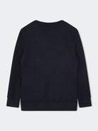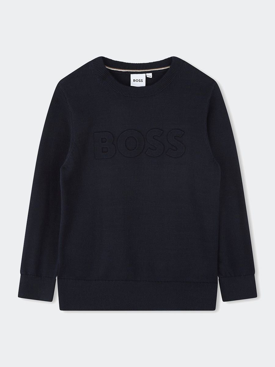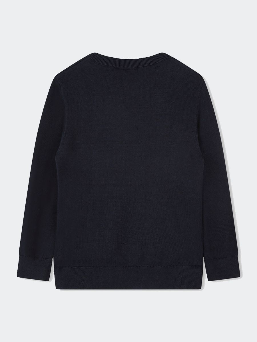 Crew neck, long sleeved, plain yarn sweater with embossed matching logo on the front