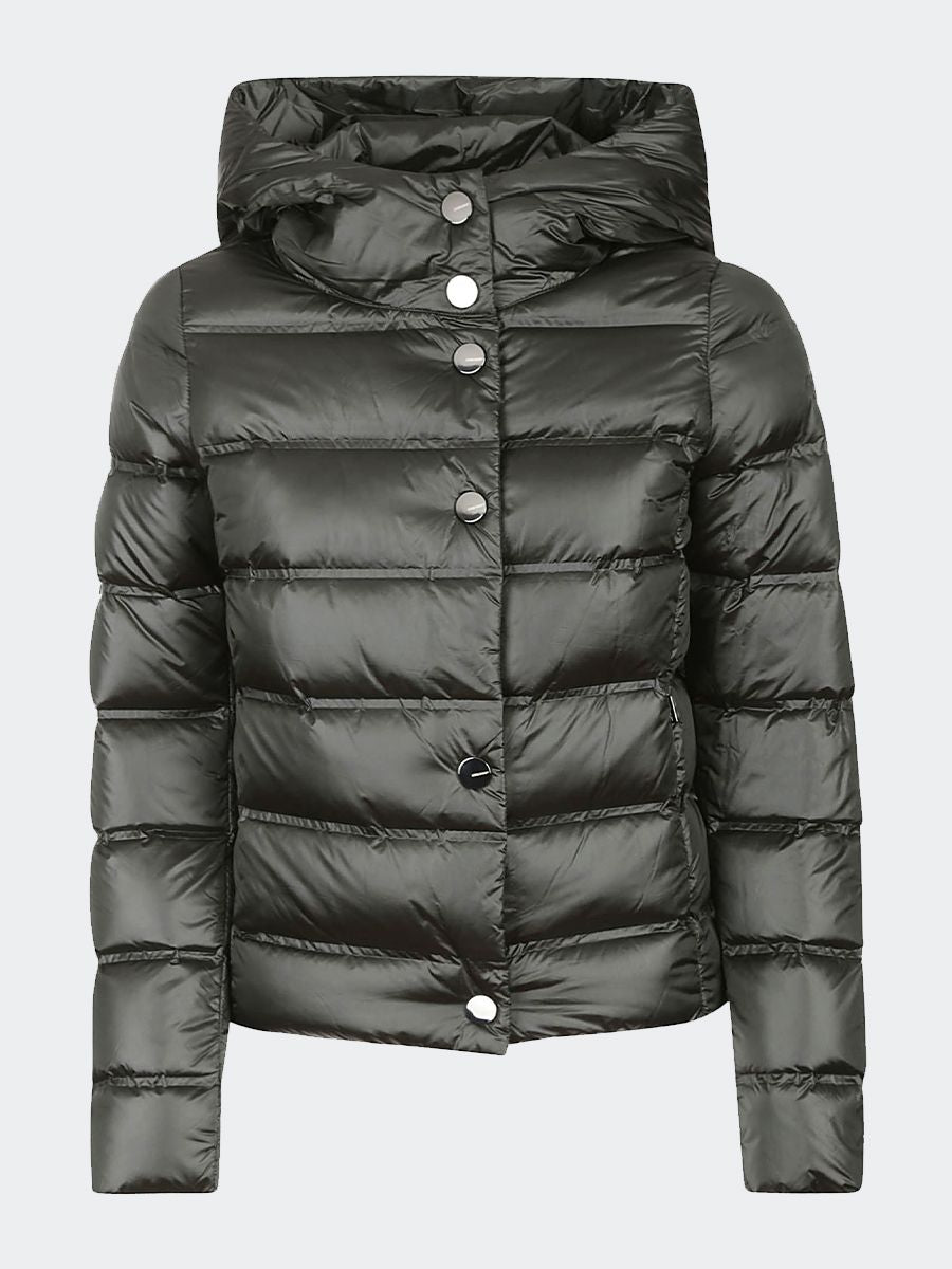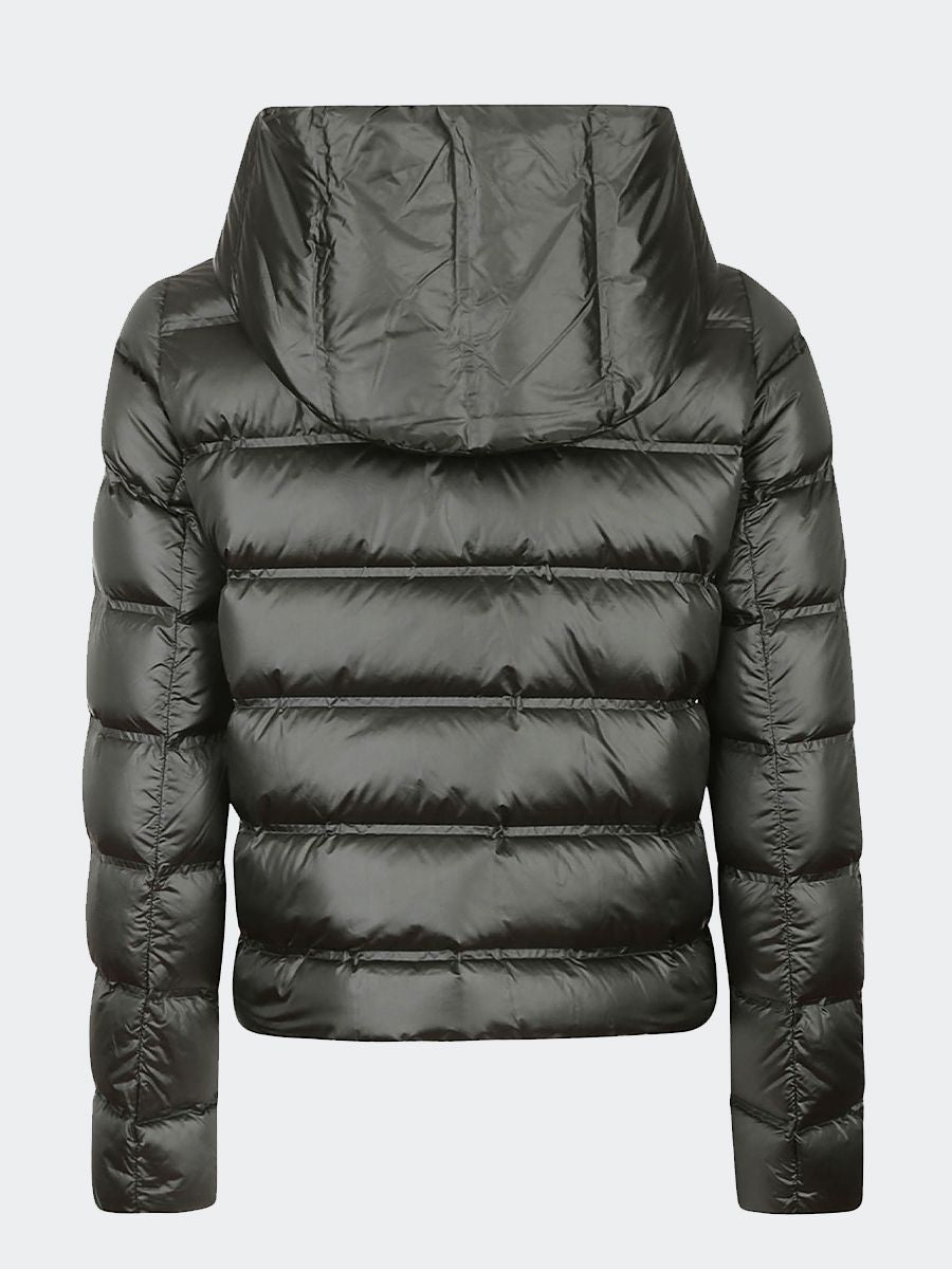 Down jacket in tubular stretch nylon treated with ultrasonic technique SANDY is extremely comfortable with fixed hood. Elastic and light with press studs and invisible side zip pockets