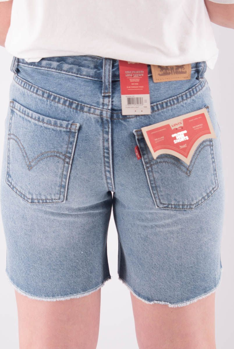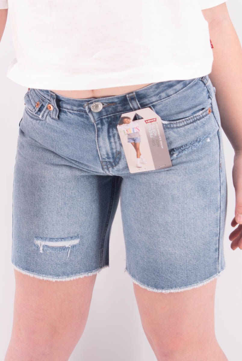 Shorts made of blue denim with a used wash, zip and logo button, slim fit and a non-uniform texture, easy to combine with other items from the collection