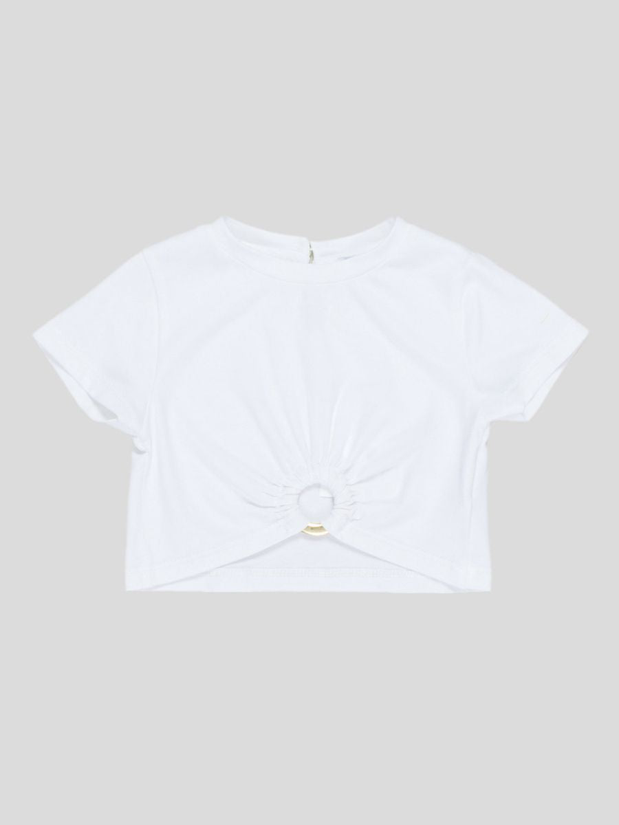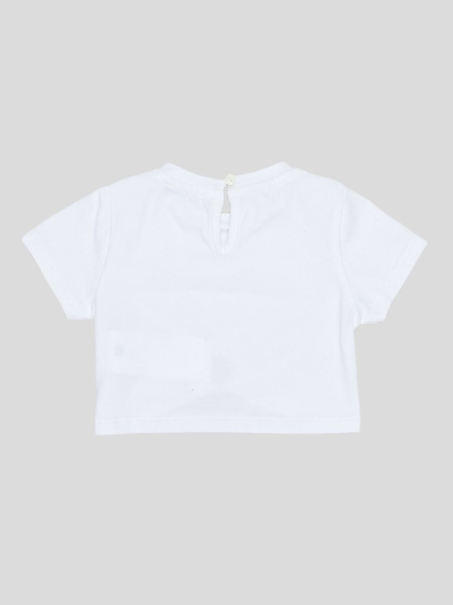 T-shirt girocollo manica corta tnta unita con decorazione sul fondo. Bottone retrocollo