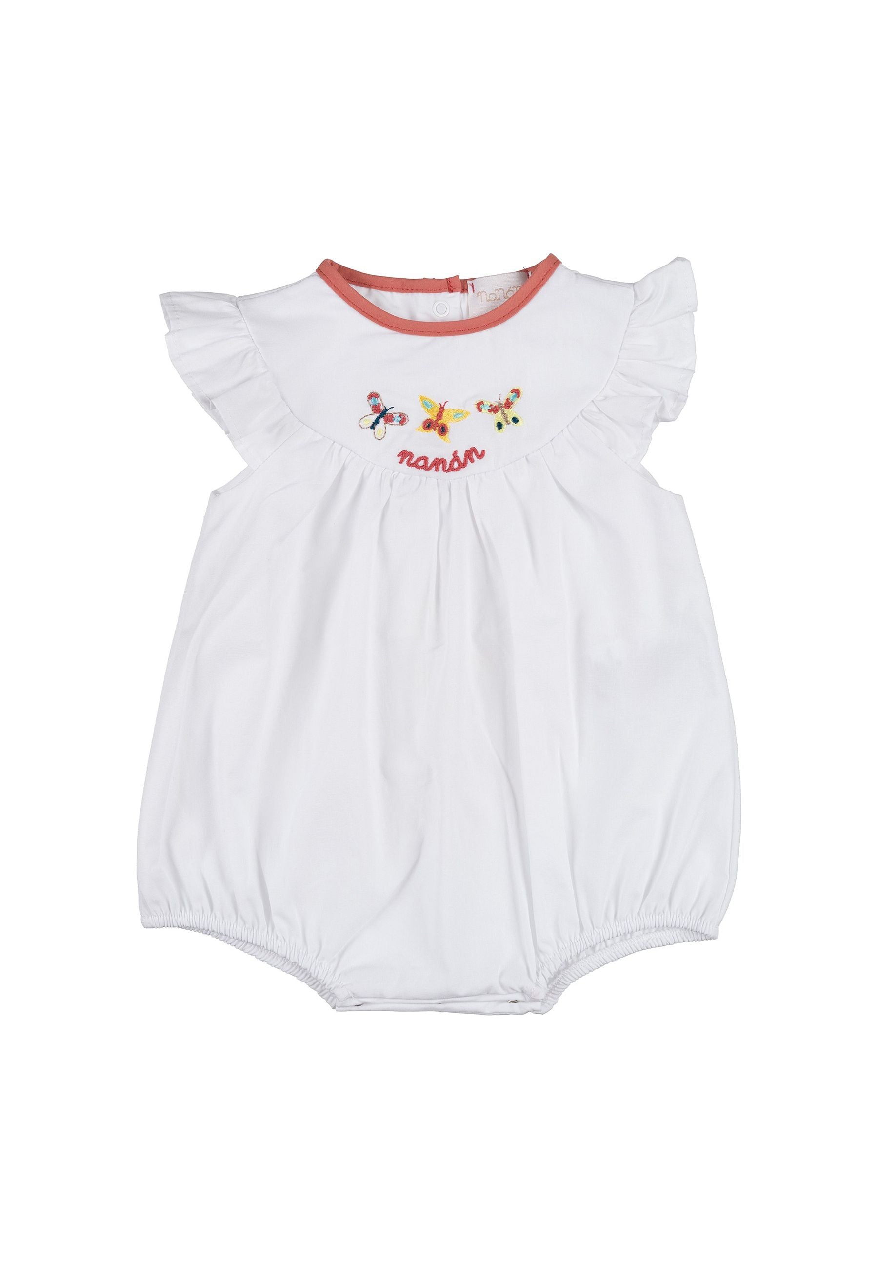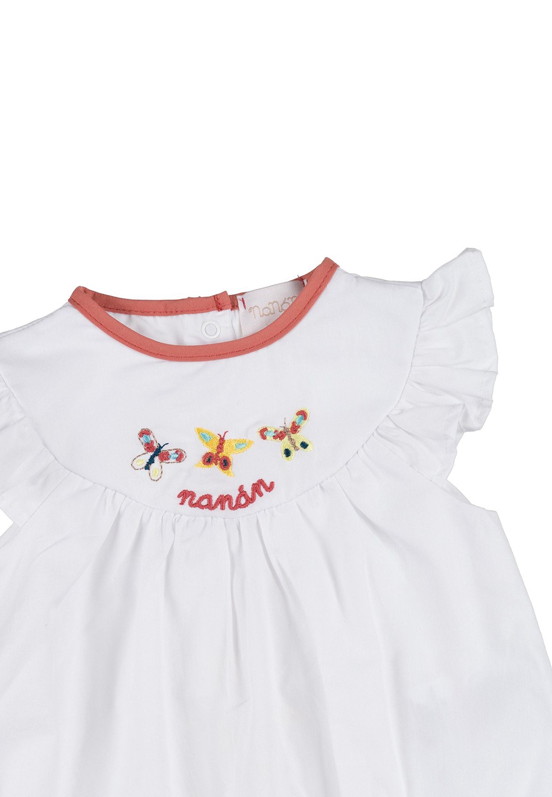 Tutina Deliziosa tutina con volant resa particolare dal ricamo di tre dolcissime farfalle.