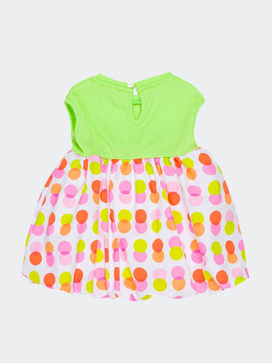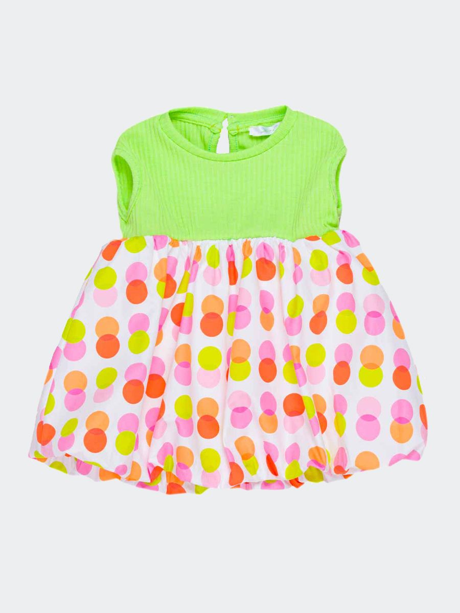 Abito girocollo smanicato con il petto a costine e gonna in stoffa a fantasia multicolor a pois