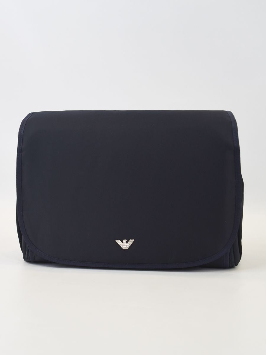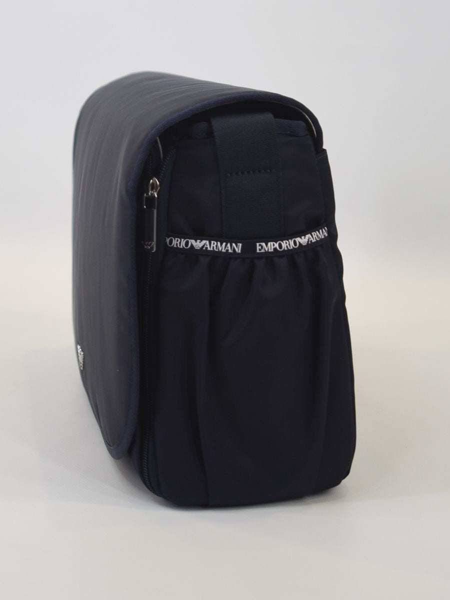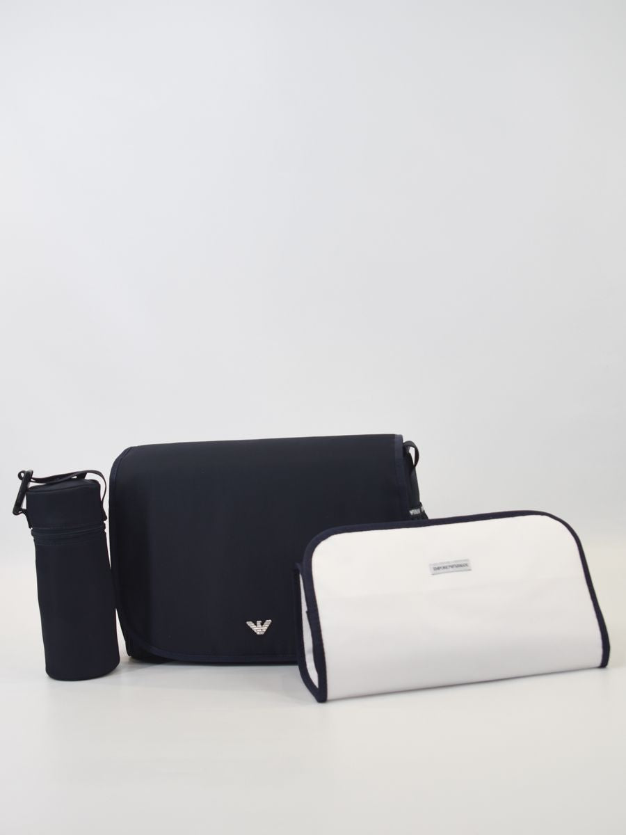 Borsa Set composto da 3 pezzi: borsa telo per il cambio e portabiberon. Borsa in tessuto tecnico tinta unita con Brand Logo. Chiusura a calamita con tasche interne e scomparti interni.Tracolla regolabile e portabiberon con zip in coordinato.ideale per neomamme progettata con cura e pensata per essere pratica e funzionale. Realizzata in nylon imbottito presenta un'elegante aquila metallica come distintivo di marca. Dotata di tasche organizer laterali una tasca a strappo posteriore e una chiusura con patta e bottoni magnetici per una maggiore sicurezza. All'interno troverai un ampio scomparto con zip foderato in tessuto insieme a una tasca con zip e diverse tasche a toppa e a rete per organizzare al meglio gli oggetti. Questa borsa comprende anche un pratico fasciatoio estraibile e un portabiberon coordinato per le necessità del tuo bambino. La tracolla regolabile in tela offre comfort e versatilità con una lunghezza di 73 cm dalla spalla