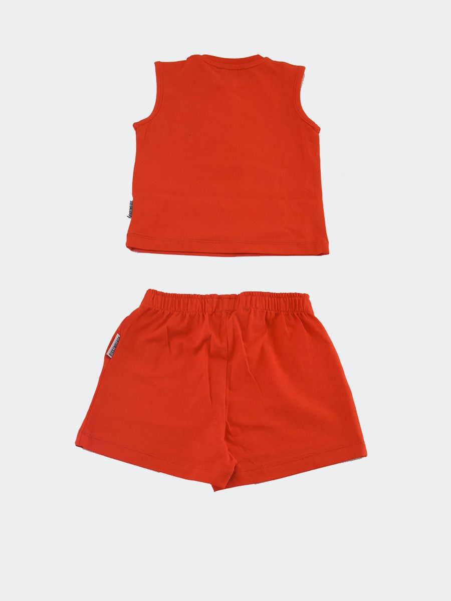 Completo composto da smanicato con Stampa frontale e Bermuda tinta unita con cordino di regolazione su girovita tasche a filo
