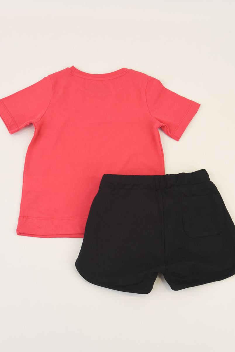 Completo Sportivo composto da t-shirt girocollo manica corta in jersey stampata sul petto e pantaloncino con elastico in vita tasca dietro