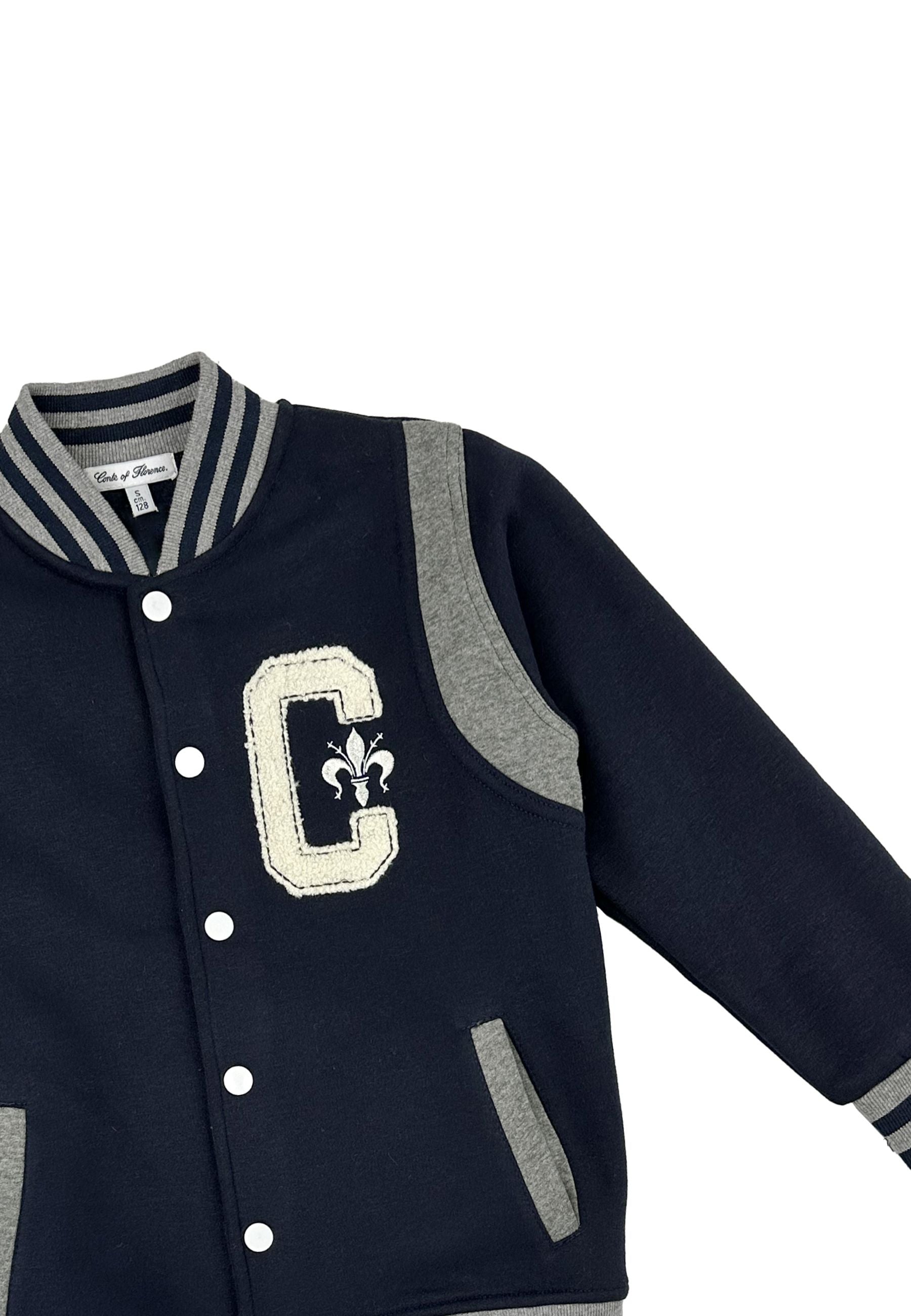Felpa college blu e grigia dal design elegante e sportivo realizzata con chiusura frontale a bottoni collo polsi e fondo in tessuto elastico per un comfort ottimale tasche laterali pratiche e funzionali maxi logo sul lato cuore ripetuto con carattere deciso dietro le spalle per uno stile autentico e distintivo un capo esclusivo firmato Conte of Florence distribuito da Bimbivip partner storico affidabile e riconosciuto a livello europeo punto di riferimento per famiglie che ricercano qualità originalità e garanzia di marchi prestigiosi capace di offrire sempre un’esperienza d’acquisto appagante sicura e soddisfacente