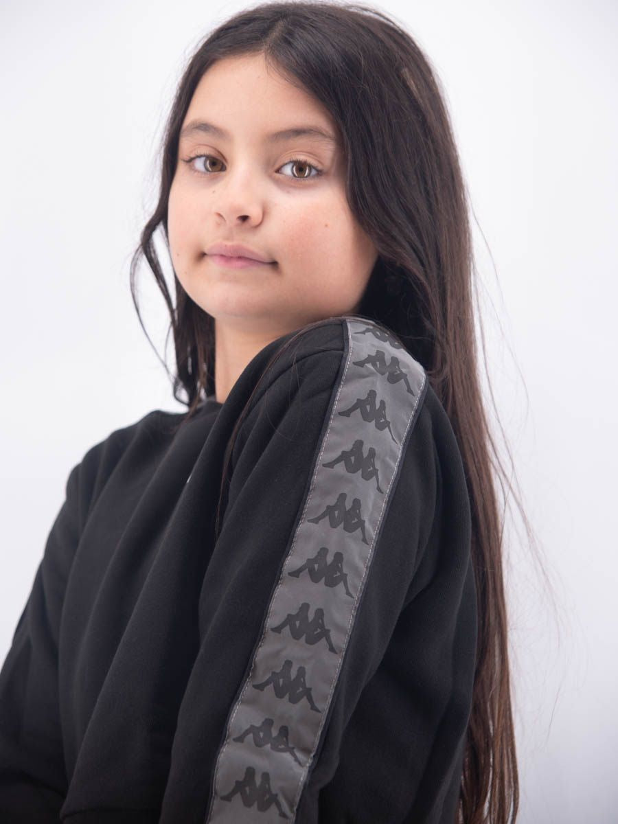 Felpa modello cropped girocollo a manica lunga con bande con logo ripetuto applicate lateralmente. Mini logo ricamato sul cuore. Vita e polsini elasticizzati.