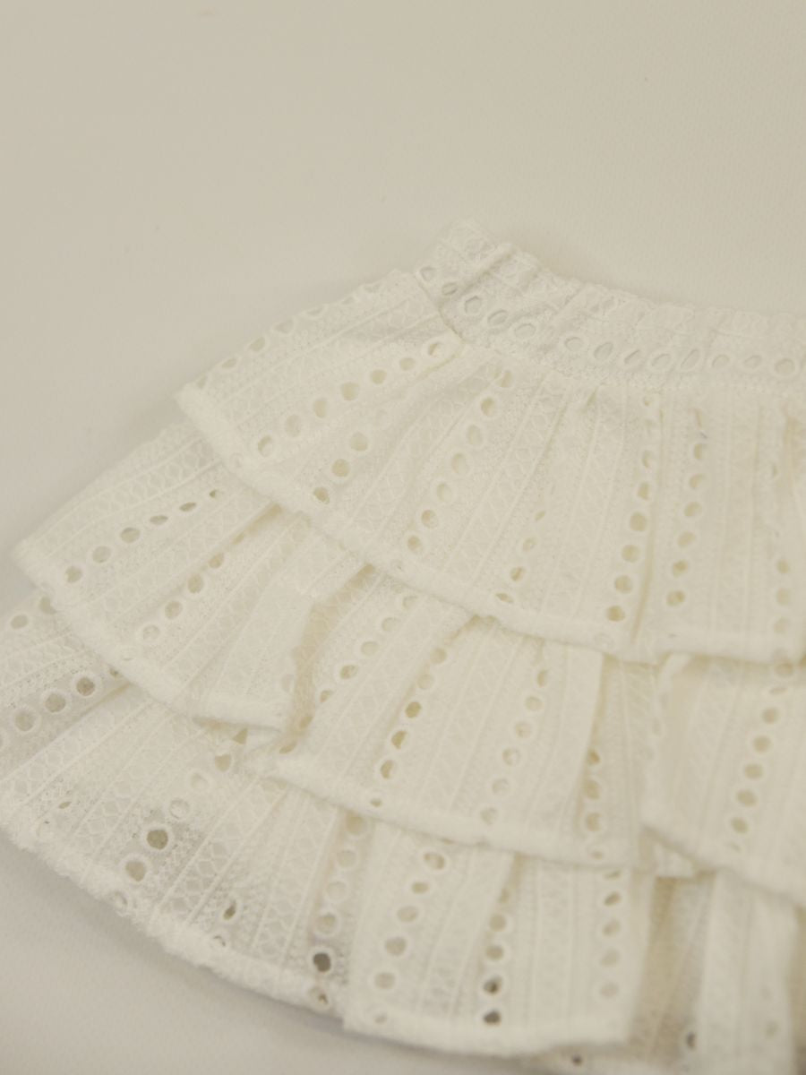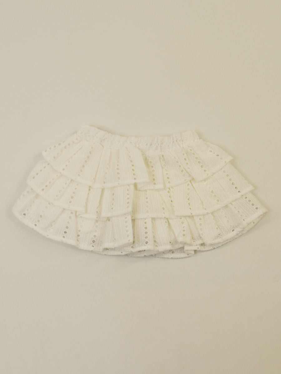 Gonna tinta unita in pizzo con girovita elastico. Modello decorato con tessuto lavorato ripreso in tre punti per dare ampiezza