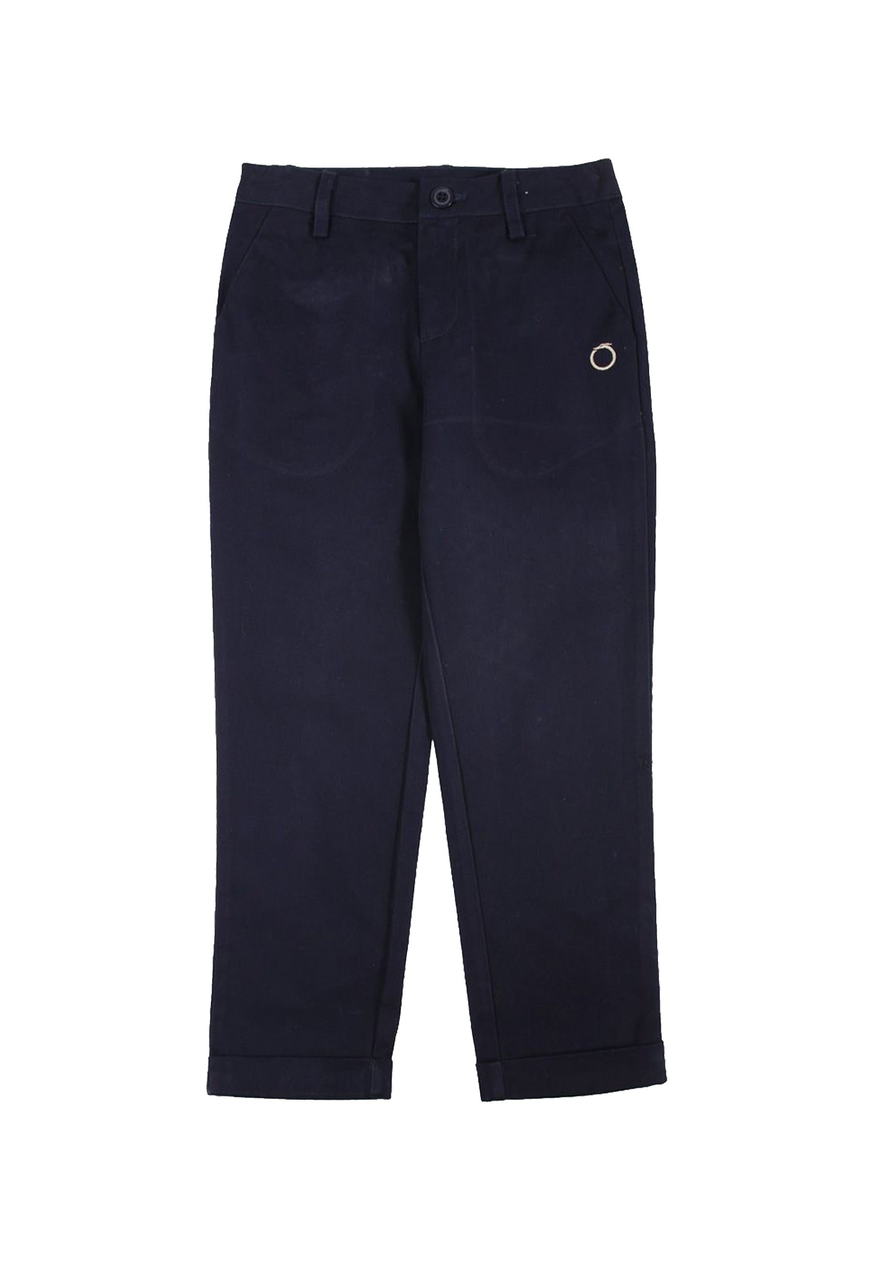 Pantalone classico a tinta unita taglio dritto con tasche diagonale e Logo ricamato. Tasche posteriore a bottoni con risvolto