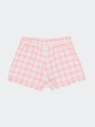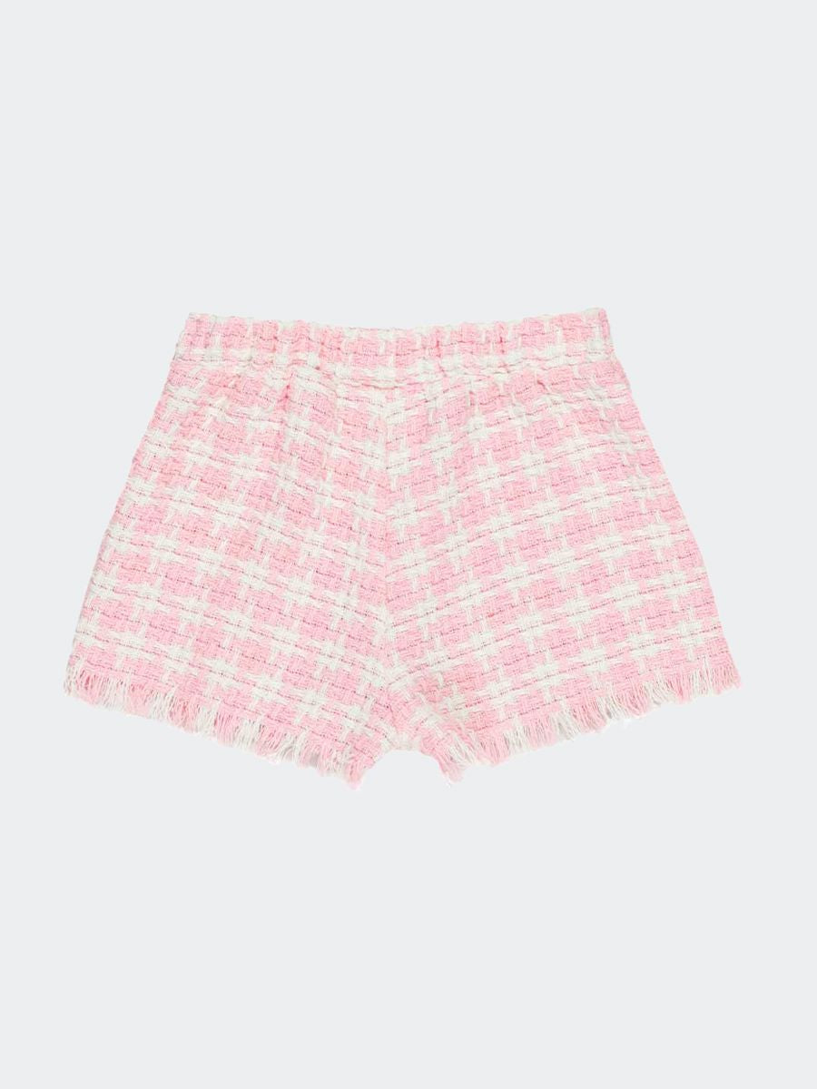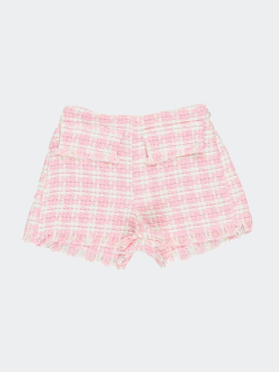 Shorts in tessuto a fantasia abbinabile con la giacca. Tasche frontali e fondo non rifinito